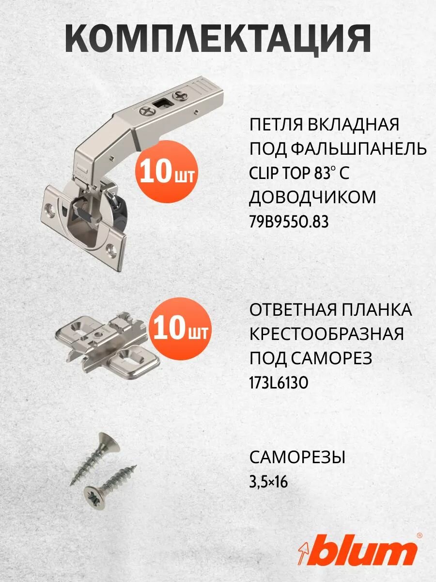 Петля мебельная с доводчиком Blum CLIP top BLUMOTION вкладная, под фальшпанель с углом открывания 83° подходит для угловых кухонных модулей и фальшпанелей. Если при открытии фасад ударяется о стену или соседнюю дверцу нужно как-то уменьшить угол ее открывания, для этого в помощь приходит петля с углом открывания 83 градуса. Благодаря встроенной системе Blumotion, после установки больше нет необходимости думать о дополнительных доводчиках для мягкого и бесшумного закрывания двери. Преимущества петли блюм: Угол открывания 83°; С удобной регулировкой по глубине с помощью механизма шнек фасад устанавливается и снимается с корпуса без инструмента; Петля с доводчиком 79B9550.83 специально разработана для установки под фальшпанель; Испытанная и удобная 3-мерная регулировка для идеального рисунка фасадов; Доводчик - амортизатор Blumotion, интегрированный в чашку; Возможность деактивации доводчика для легких дверей; Качество на весь срок службы мебели; Новая траектория движения для толстых фасадов; Глубина сверления всего дo 13 мм; Простая установка и регулировка ответной планки; Рассчитана на 200 000 циклов открывания / закрывания - это больше всего срока службы мебели; Используется со всеми существующими ответными планками и приспособлениями. Технические характеристики петли BLUM 79B9550.83: