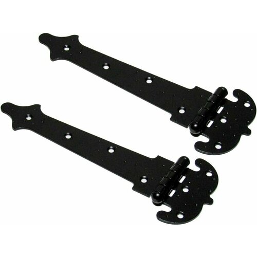 Красивое внешнее оформление. Стрельчатые петли для ворот создаются «под старину». Они красиво смотрятся в сочетании с деревом, их можно ставить даже с лицевой стороны. Несмотря на изящество, элементы прочные и выдерживают сильные внешние нагрузки