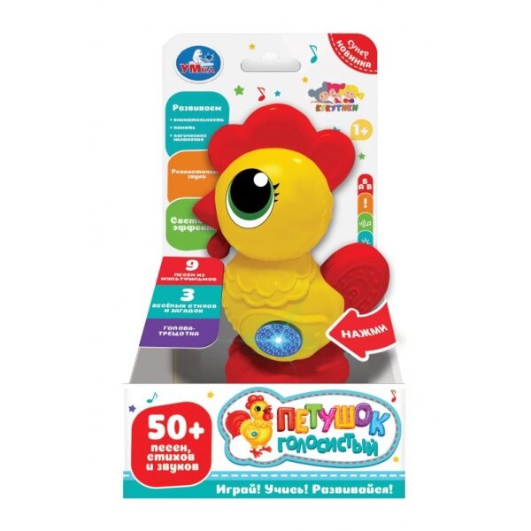 Малыш с удовольствие будет играть с этим ярким петушком и слушать весёлые песни, добрые стихи и загадки. Благодаря компактным размерам игрушку удобно брать с собой на прогулки.