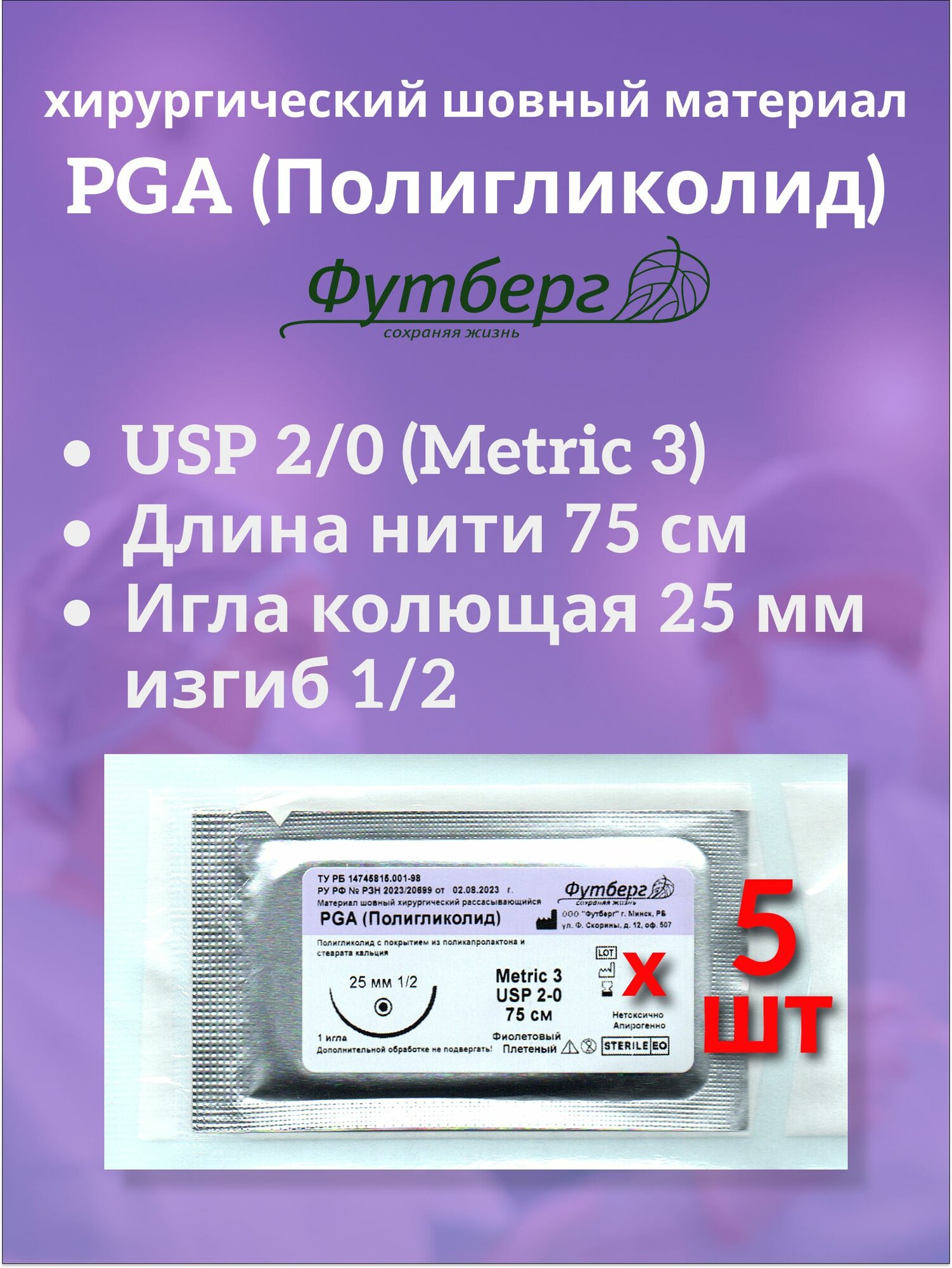 PGA (Полигликолид) USP 2/0 (M2), длина 75см, игла колющая 25мм, изгиб 1/2, (5 штук) Шовный хирургический материал Футберг: сравнение цен, характеристики, фото, актуальное наличие и цены.