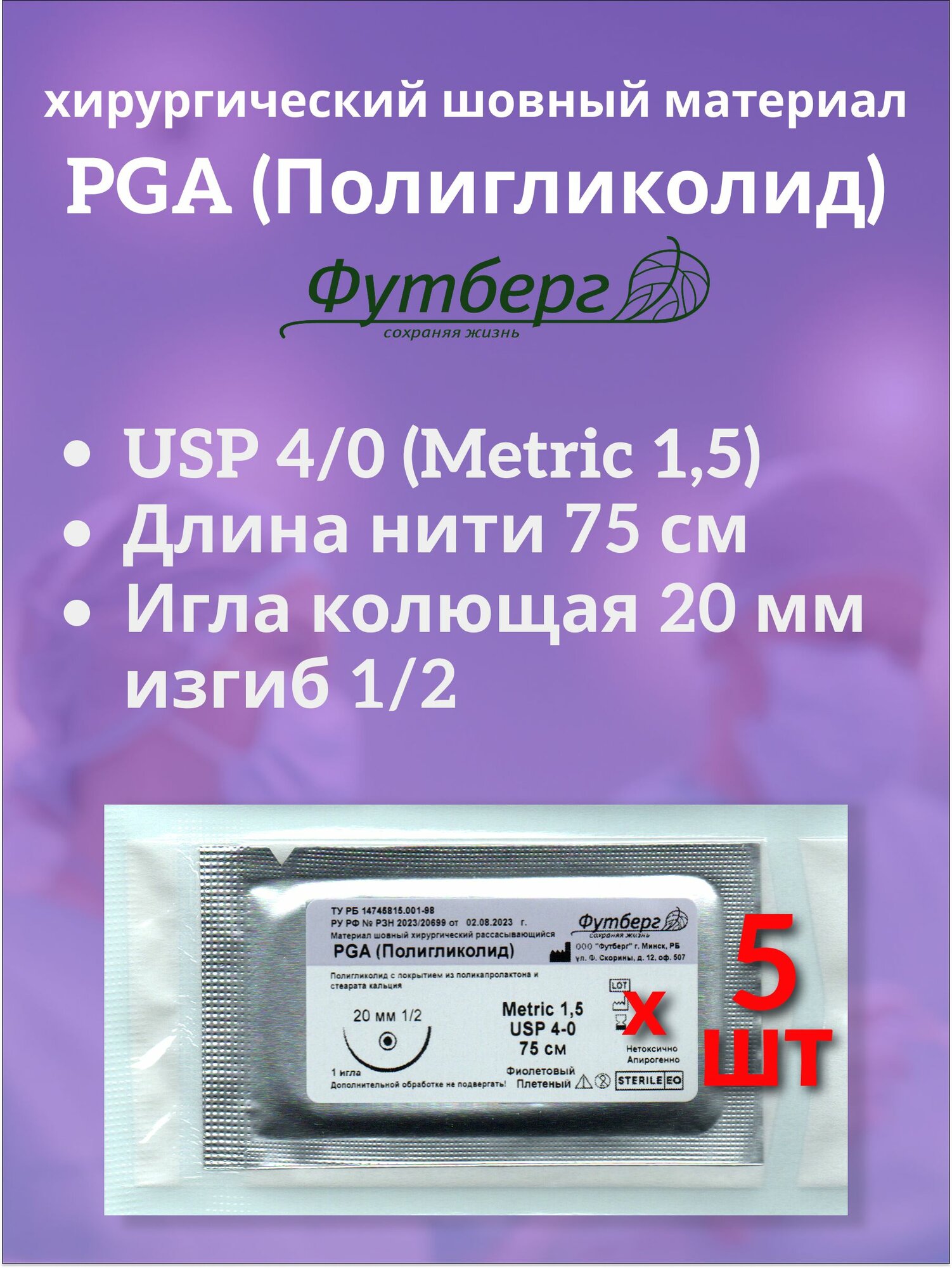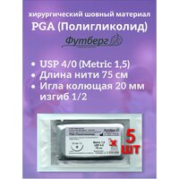 PGA (Полигликолид) USP 4/0 (M1,5), длина 75см, игла колющая 20мм, изгиб 1/2, (5 штук) Шовный хирургический материал Футберг: сравнение цен, характеристики, фото, актуальное наличие и цены.
