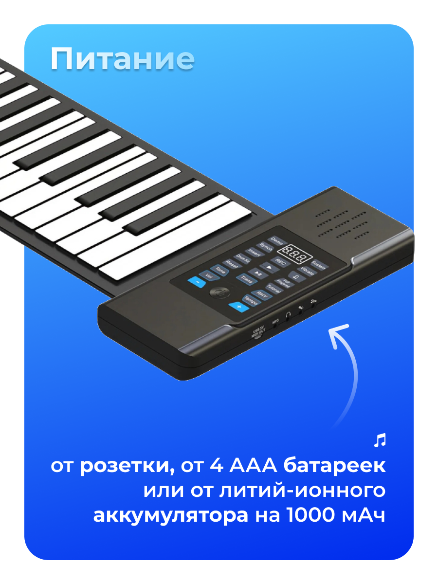 Silicon Flexible Roll Up Piano PD88 – портативное пианино с 88 клавишей. Выполнено из гибкого силикона, благодаря чему быстро сворачивается в рулон. Помимо встроенного динамика устройство поддерживает подключение наушников, колонок. Доступно 128 тонов, 128 ритмических паттернов, 14 демо-мелодий. Есть функции записи, проигрывания, редактирования, регулировка громкости, вибрато, аккорды, обучающий режим. Устройство может быть подключено к компьютеру через Midi-выход или Micro-USB, а также к iPad, iPhone и Android устройствам. Питание возможно от кабеля питания USB-DC 5 В, от батареек ААА или от встроенного аккумулятора на 1000 мАч.