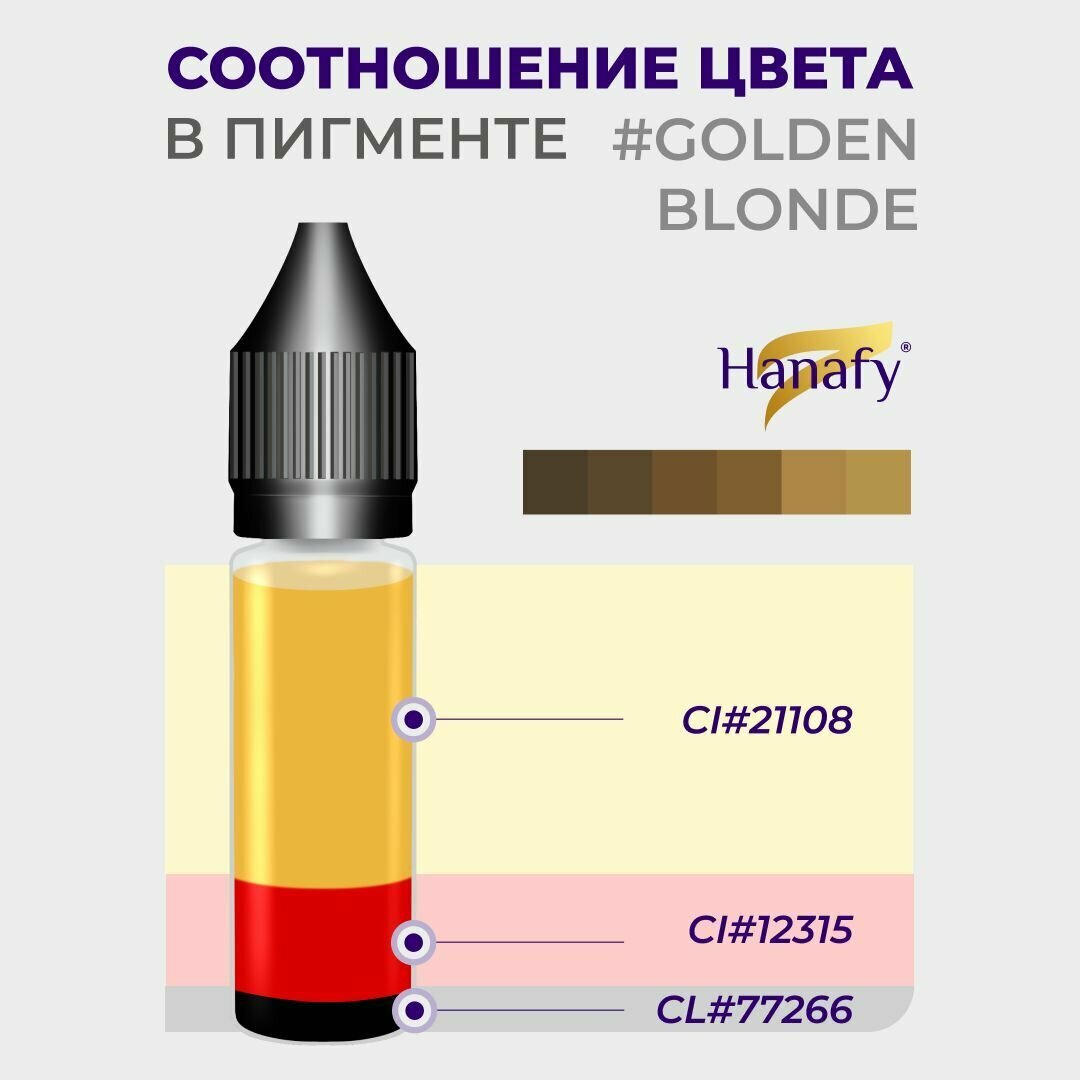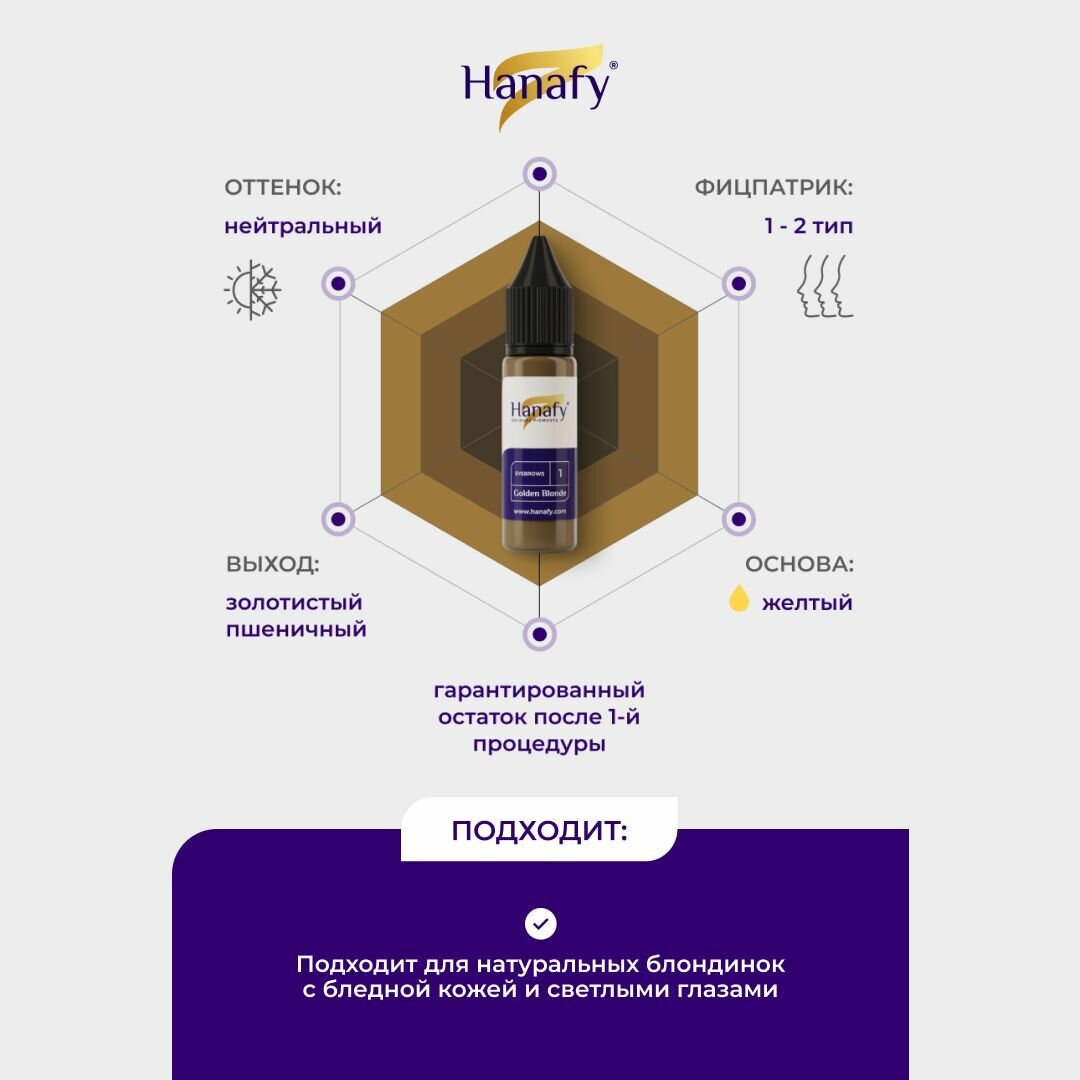 №1 Golden Blonde — золотистый пшеничный пигмент на жёлтой основе, самый светлый в палитре. Для блондинок с бледной кожей и светлыми глазами; также для возрастных клиенток, которым не идут яркие брови. Не желтит, со временем становится нехолодным светло-коричневым. Результат татуажа выглядит натурально и благородно, раскрывая естественную красоту блондинок, и может стать альтернативой декоративной косметике для глаз и краске для бровей.