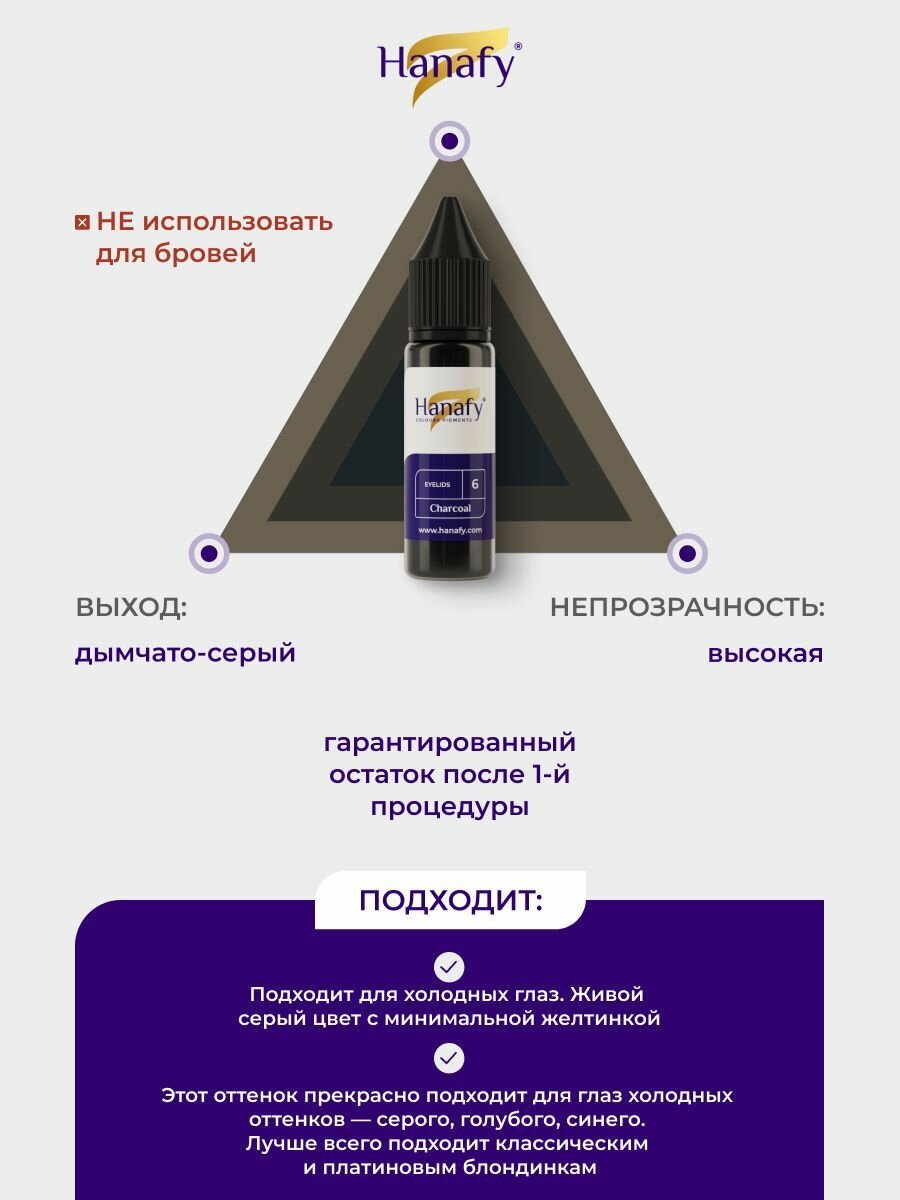 Пигмент для перманентного макияжа век №6 Charcoal (Уголь) — это живой серый цвет с минимальной желтинкой, который идеально сочетается с глазами холодного оттенка, такими как серые, голубые и синие.