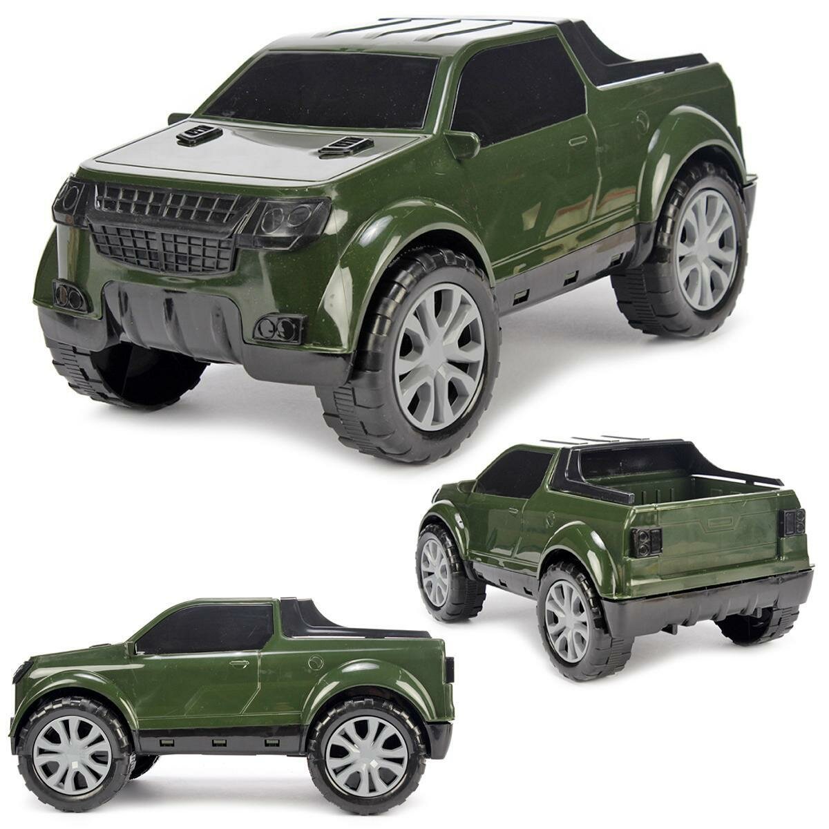 игрушечный пикап, выполненный в масштабе, окрашен в тёмно-зелёный цвет с гладкой блестящей поверхностью, колёса сделаны из черного резиноподобного материала, крупные и рифлёные для лучшего сцепления, дизайн включает гриль спереди, фары и заднюю часть пикапа, стилизованные под настоящий автомобиль, капот имеет две декоративные вентиляционные решётки, кузов представлен со съемным задним отсеком, кабина автомобиля имеет затемненные окна