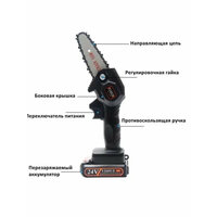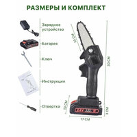 Мини-цепная садовая электропила для обработки древесины, легких и небольших деревьев. С таким садовым инструментом Вам потребуется около 10 секунд чтобы распилить бревно диаметром 15-20 см. Благодаря легкости и компактным габаритам мини пила незаменима в любом хозяйстве. Отличается маневренностью и удобством в транспортировке, является прекрасным выбором для походов. С её помощью можно легко запастись дровами для растопки бани или заготовить их на весь холодный сезон.Дизайн и эргономика разработаны для легкого и удобного использования одной рукой. Небольшой вес ( 700 г. ) делает данную модель крайне удобной. Однако несмотря на легкий вес, пила обладает мощным двигателем долгой службы, двигатель также защищен от перегрева, поскольку он автоматически отключается при превышении температуры. Простая регулировка натяжения цепи без необходимости разборки. Натяжение цепи можно легко отрегулировать с помощью винта, не разбирая саму пилу: у основания лезвия находится винт, затягивая который происходит натяжение лезвия. Одноручная пила поставляется с литиевой аккумуляторной батарей 24В. Внимание чтобы пила работало хорошо. После получения зарядите на 3-4 часа аккумулятор и тогда Пила будет работать мощно и быстро