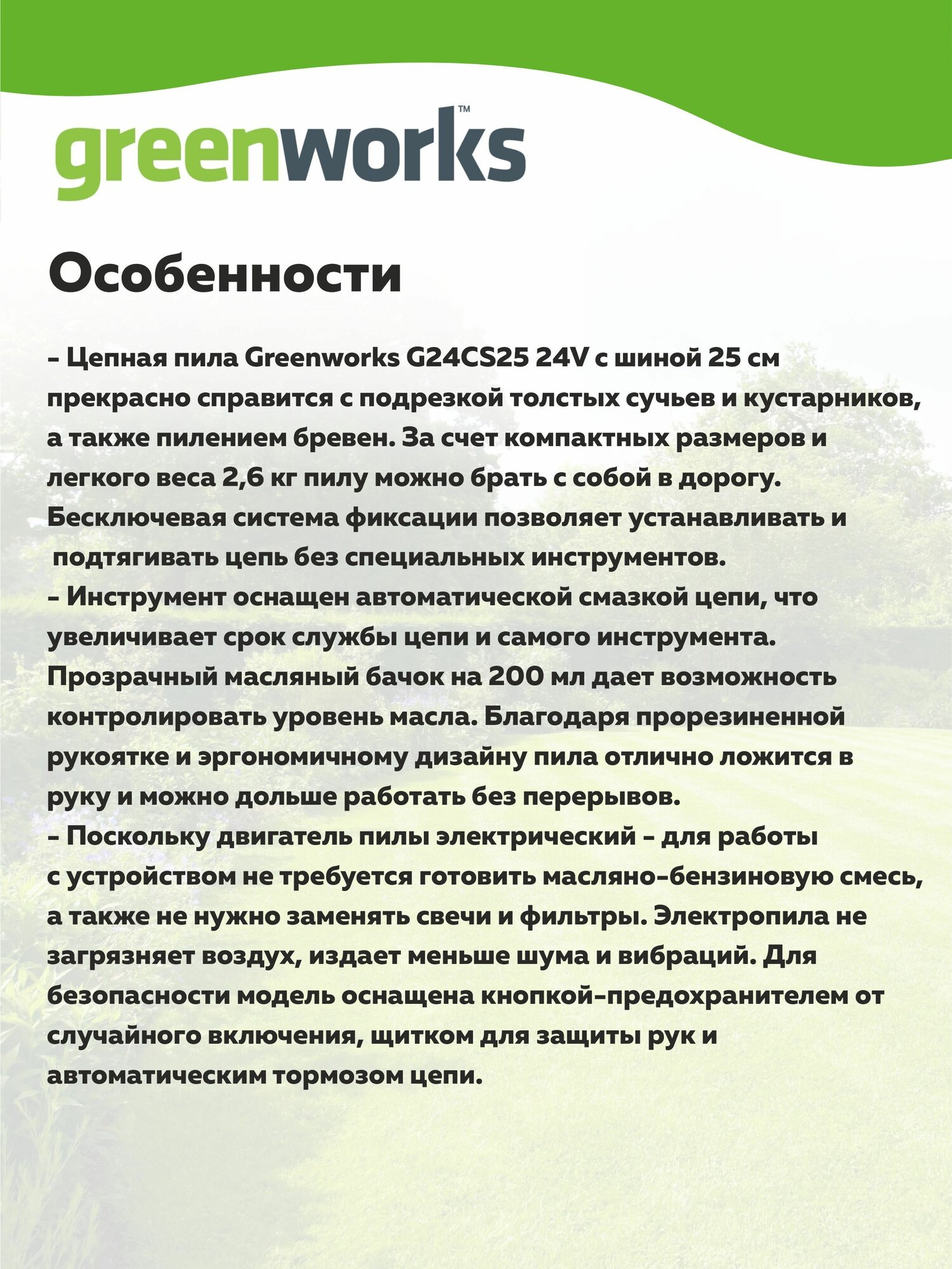 Купить Пила аккумуляторная цепная Greenworks G24CS25K4 24V с АКБ 4 Ач и ЗУ (2007707UB) с доставкой по всей России. Пила аккумуляторная цепная Greenworks G24CS25K4 24V с АКБ 4 Ач и ЗУ (2007707UB): сравнение цен, характеристики, фото, актуальное наличие и цены.
