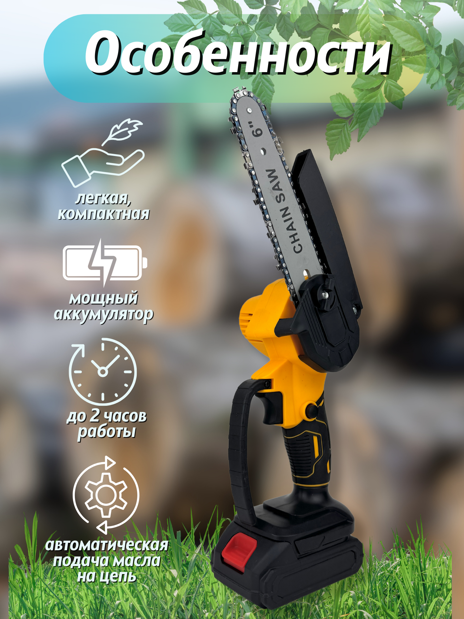 | Особенности конструкции | антивибрационная система, бесключевая замена оснастки, блокировка кнопки включения, мини-пила, прорезиненная рукоять, регулировка натяжения цепи без инструмента |
