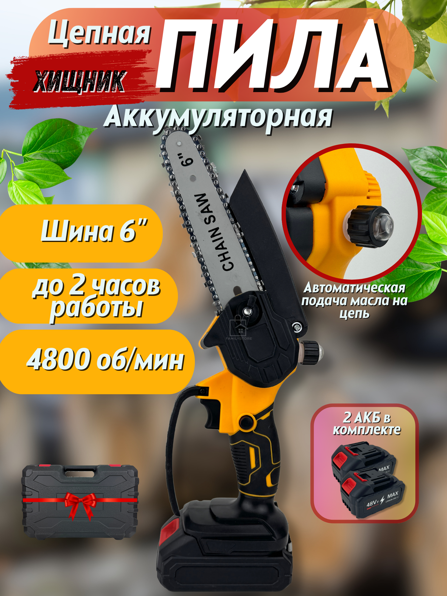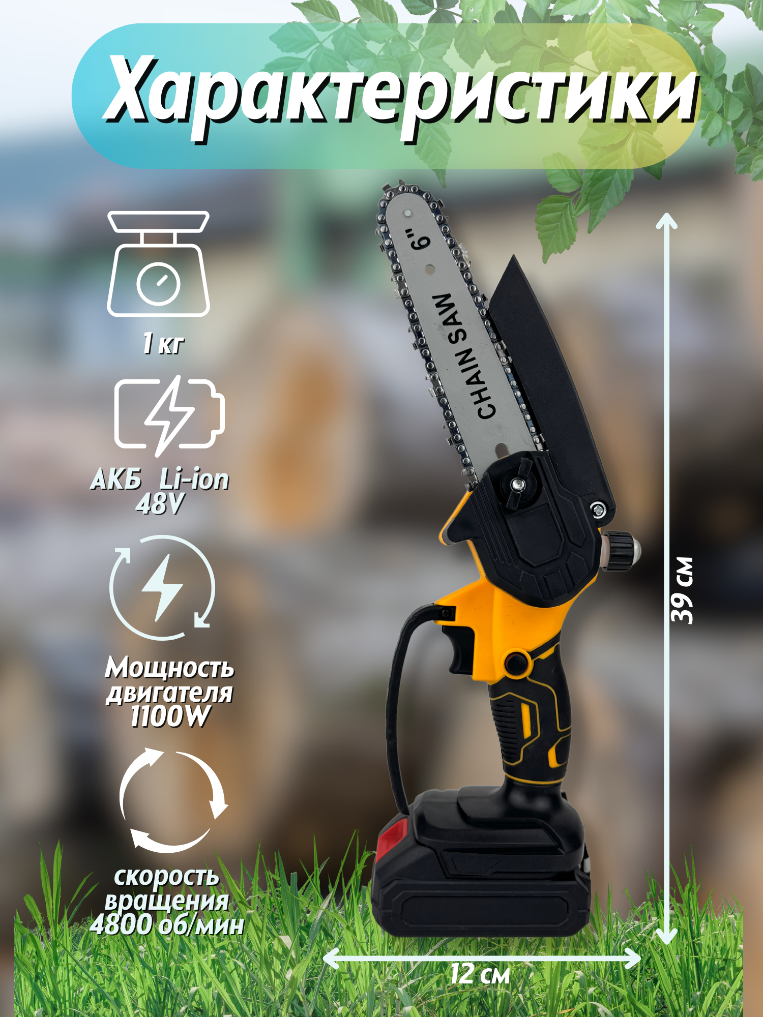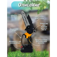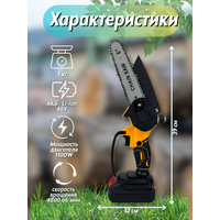 | Комплект поставки | Пила цепная-1 шт, Шина-1шт, Цепь 12-дюймовая, Литий-ионный аккумулятор-2шт, Зарядное устройство, Защитный кожух, Дополнительная рукоять для вертикальной поддержки, Торцевой ключ, Отвертка, Прочный кейс для хранения. |