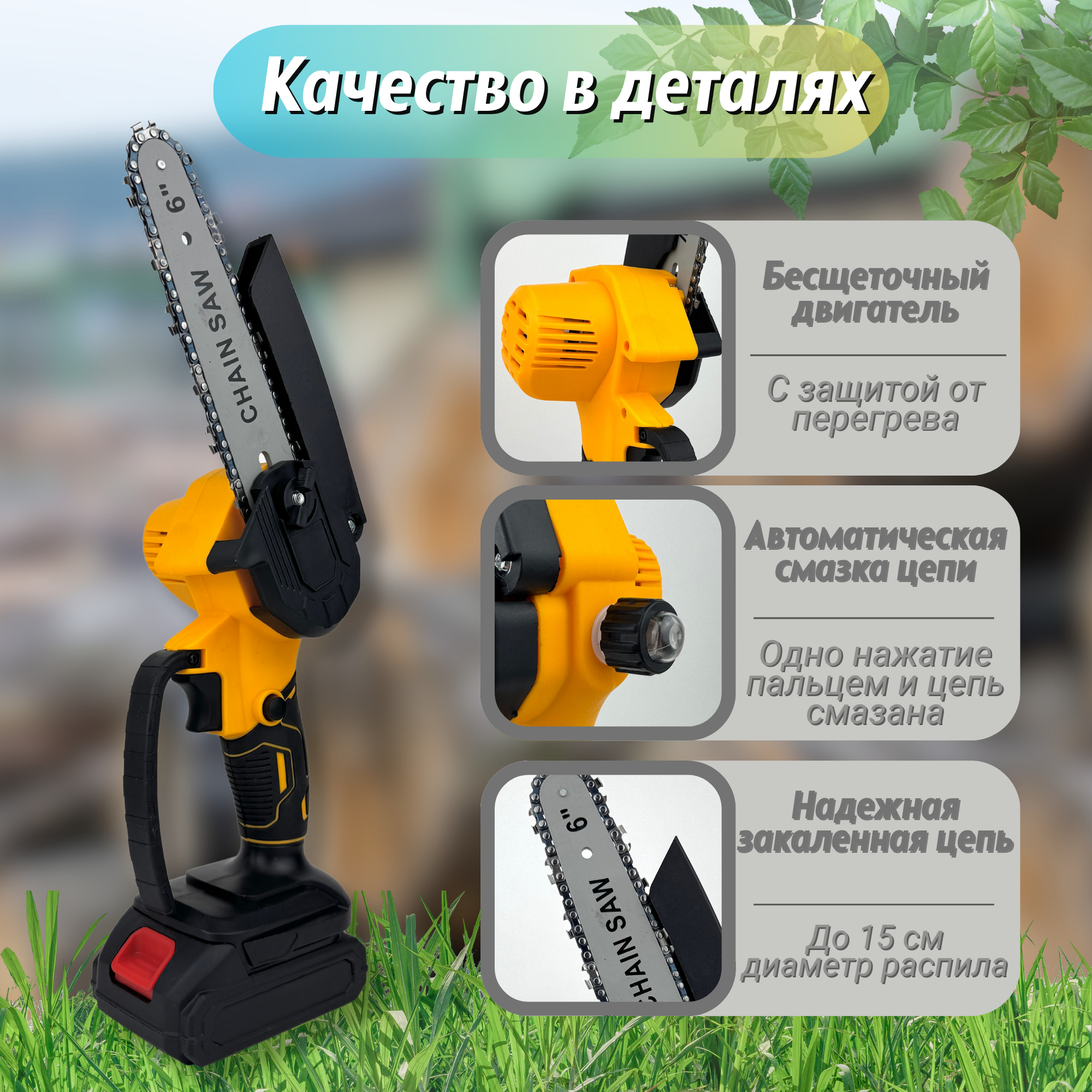 Купить Пила аккумуляторная цепная хищник с подачей масла и защитой рукоятки, желтая с доставкой по всей России.