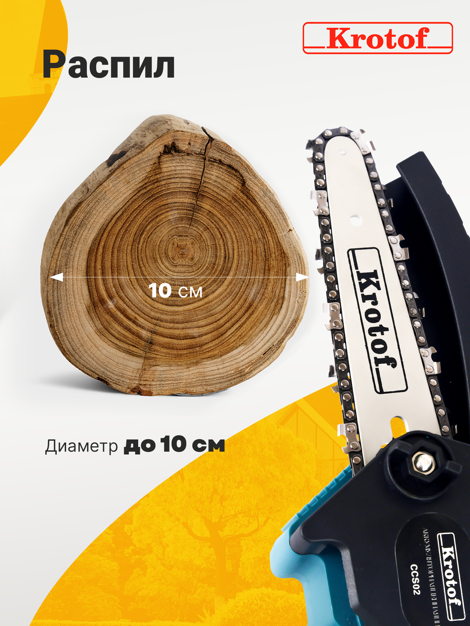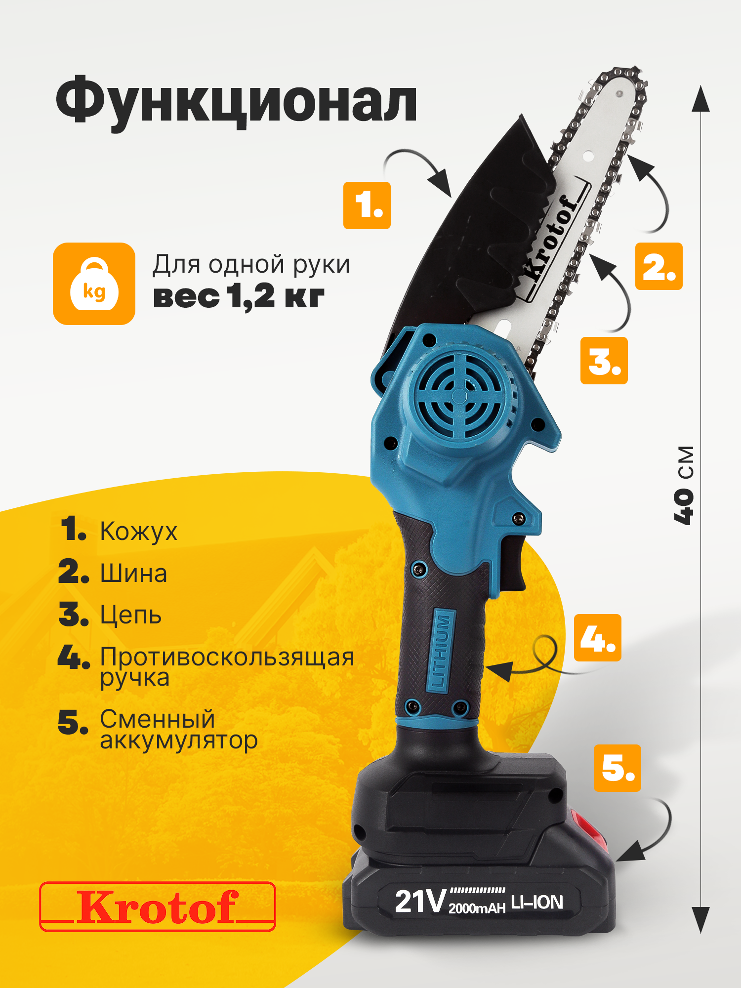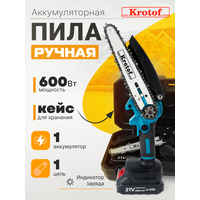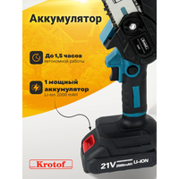 Пила аккумуляторная цепная Krotof CCS01-1 предназначена для бытового использования. Может стать заменой бензопилы для легких работ, а также таких ручных инструментов, как топор, ножовка и ручная пила. Легко отпилит мелкие сучки и ветки садовых деревьев и кустарников, а также распилит небольшие поленья диаметром до 10 см. Вес пилы 1.2 килограмма! Съемный аккумулятор пилы и ее небольшой размер позволяет экономить место при хранении. В комплекте 1 острая цепь из нержавеющей стали и 1 шина 6" (15,3 см), а так же один мощный аккумулятор. Емкость аккумулятора составляет 2000 m*Ah, что позволяет непрерывно работать до 1,5 часов. АКБ оснащен индикацией уровня заряда.