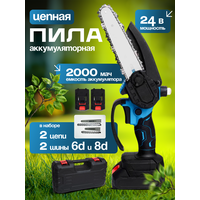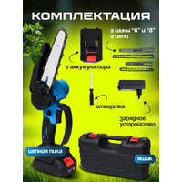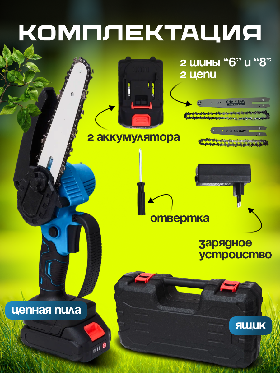 В комплекте с пилой идут две шины для цепи (6 см и 8 см), цепь износостойкая, два аккумулятора, зарядное устройство, отвертка и удобный кейс для хранения и транспортировки. Кейс защищает инструмент от пыли и повреждений, а также придает удобство при транспортировке.