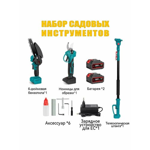 Аккумуляторный садовый набор секатор с пилой и телескопической штангой - идеальный инструмент для вашего сада или огорода. Этот мощный электрический инвентарь прекрасно подходит для обрезки деревьев, кустарников и веток, благодаря храповому механизму легко справляясь даже с самыми толстыми стволами. Профессиональный автосекатор предназначен для резки различных видов деревьев, включая вишню, коктейльные деревья и другие фруктовые растения. С его помощью вы сможете подрезать лишние веточки и придать растению идеальную форму. Сучкорез в комплекте с мини-пилой пригодится для обработки больших веток и точной обрезки сучков. Такой набор инструментов сделает процесс обрезки растений на вашем участке лёгким и быстрым. Одно из главных преимуществ этого электроинструмента - телескопическая штанга, которая работает на аккумуляторе. Не нужно подключаться к сети и следить, чтобы хватило провода. В любом месте вы сможете дотянуться до самых высоких участков и отпилить лишние ветки. Высоторез обеспечивает чистый и ровный разрез, способствуя быстрому заживлению ран на растениях. Электросекатор оснащён удобной батареей, обеспечивающей продолжительное время работы без необходимости постоянной замены элементов питания. В комплекте 2 шт. Это делает его отличным выбором для огородников и садоводов. Универсальный инструмент подойдёт для сбора урожая на даче и для выполнения мелких работ по дому. Быстрая резка и простота в использовании, небольшой размер, беспроводной дизайн, удобство переноски, повышают эффективность работы. Нескользящая ручка соответствует инженерному дизайну, который прост в использовании и экономит трудозатраты. Он обладает хорошим эффектом рассеивания тепла и малошумной конструкцией, что может обеспечить длительный срок службы.