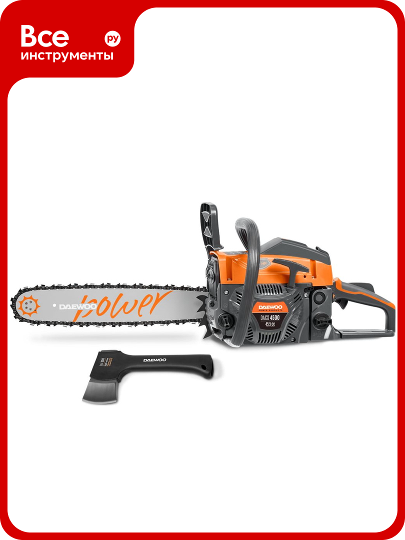 Пила бензиновая Daewoo DACS 4500 полупрофессиональная (фермерская) модель линейки бензиновых пил Master Line. Подходит для спиливания небольших деревьев и сучьев, заготовки дров и стройки. В комплекте туристический топорик. Низкопрофильная цепь длиной 40 см обеспечивает чистый и точный рез даже при работе с толстыми бревнами.