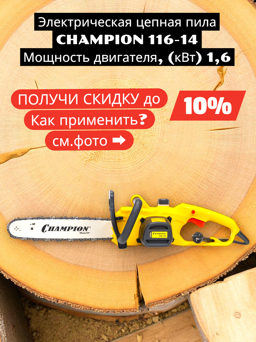 Купить Пила электрическая CHAMPION 116-14″ 3/8-1,3-52 (1,6кВт 3,14кг) с доставкой по всей России. Пила электрическая CHAMPION 116-14″ 3/8-1,3-52 (1,6кВт 3,14кг): сравнение цен, характеристики, фото, актуальное наличие и цены.