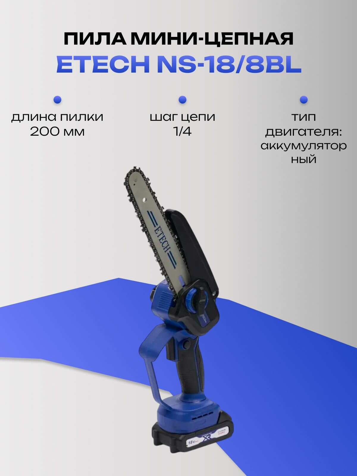 Купить Пила ETECH NS-18/8BL мини-цепная аккумуляторная бесщеточная с доставкой по всей России. Пила ETECH NS-18/8BL мини-цепная аккумуляторная бесщеточная: сравнение цен, характеристики, фото, актуальное наличие и цены.