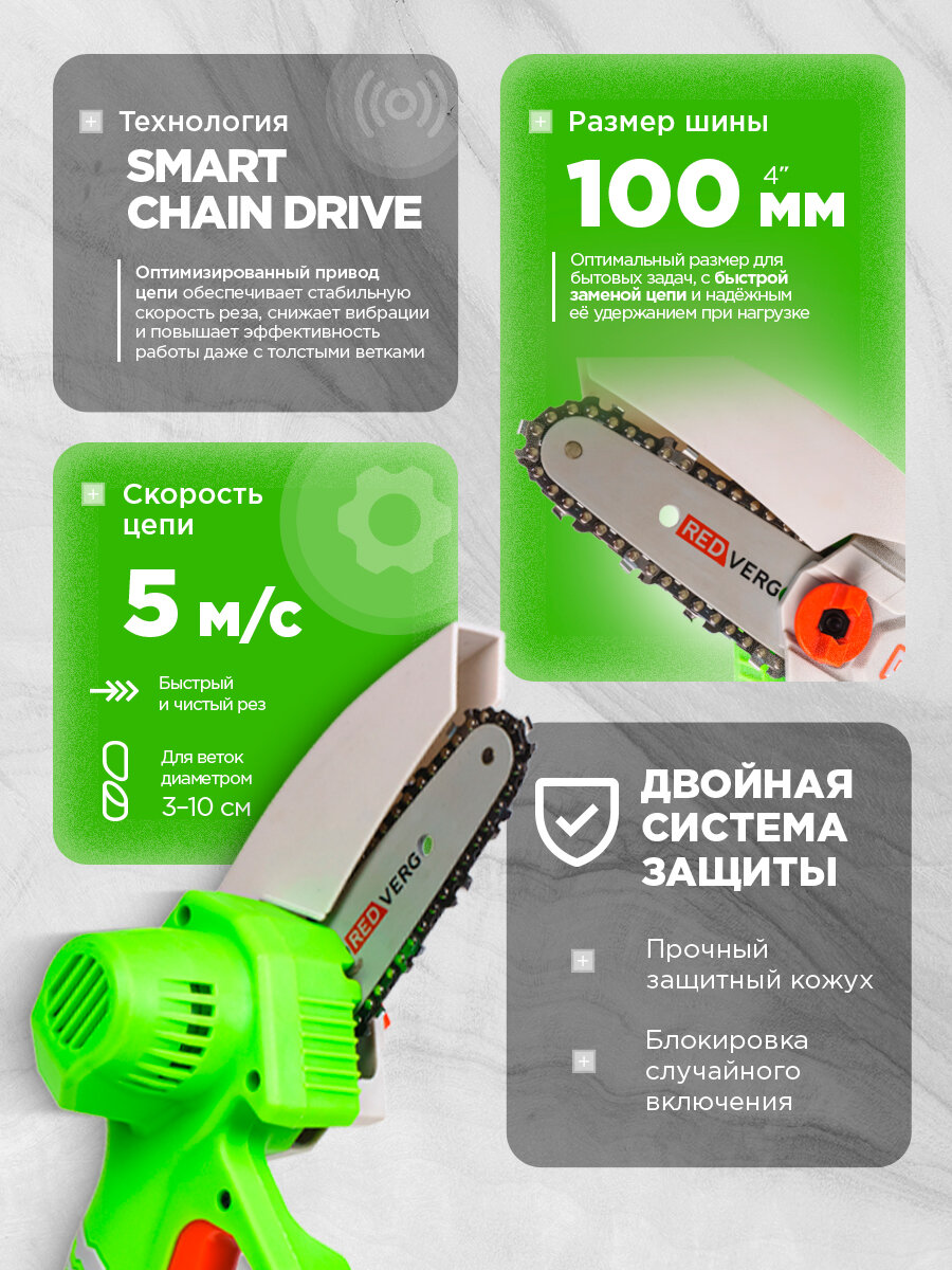 Представляем вашему вниманию новую модель аккумуляторной цепной пилы-мини от известного бренда RedVerg - RD-C18/U! Этот инструмент предназначен для бытового использования и отлично подходит для работы в саду или на даче. Основными преимуществами этой пилы являются ее небольшие размеры и легкий вес, что позволяет легко перемещаться с ней по территории и использовать в ограниченном пространстве. Также она оснащена защитным кожухом, который обеспечивает безопасность при работе с инструментом. Особое внимание стоит обратить на функцию лазерного указателя, которая поможет вам точно вырезать необходимые детали из дерева или других материалов. Это очень удобно, особенно если нужно выполнить сложную работу. Пила оснащена мощным электродвигателем, который обеспечивает высокую производительность и долговечность инструмента. Также он имеет литий-ионный аккумулятор, который обеспечивает длительное время работы без необходимости частой зарядки. Пила RD-C18/U отличается высоким качеством изготовления и надежностью работы. Она будет служить вам долго и поможет экономить время на строительстве и ремонте.
