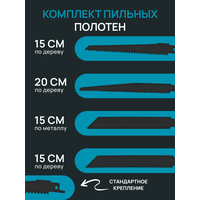 ✅ Пильные полотна из нержавеющей стали — 4 штуки: 2 по дереву, 1 по металлу, 1 универсальное