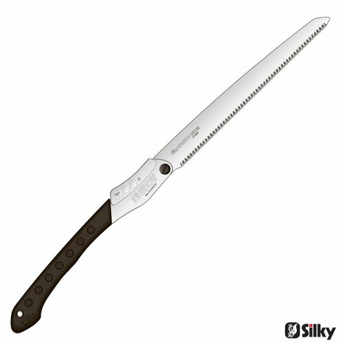 Прекрасная складная пила для работ плотницких, садовых работ и в лесу. Отлично пилит в поперечном и продольном направлении, а также по диагонали. Лезвие без разводки, благодаря конусной форме, позволяет свести к минимуму трение при пилении. Зубья направлены к рукояти, что позволяет легко запиливаться с получением чистого и ровного реза, благодаря чему сырая древесина быстро сохнет без загнивания. Легкая алюминиевая рукоять с обрезиненной поверхностью имеет фиксатор лезвия в раскрытом положении. Хромированное, с импульсной закалкой зубьев, с возможностью смены, лезвие. Имеет 2 рабочих положения. Длина лезвия 360 мм, толщина 1.3 мм, ширина 42 мм. Шаг 7, 10 или 13 зубьев на 30 мм. Полная длина 760 мм. Длина в сложенном состоянии 405 мм. Производство Silky (Япония).