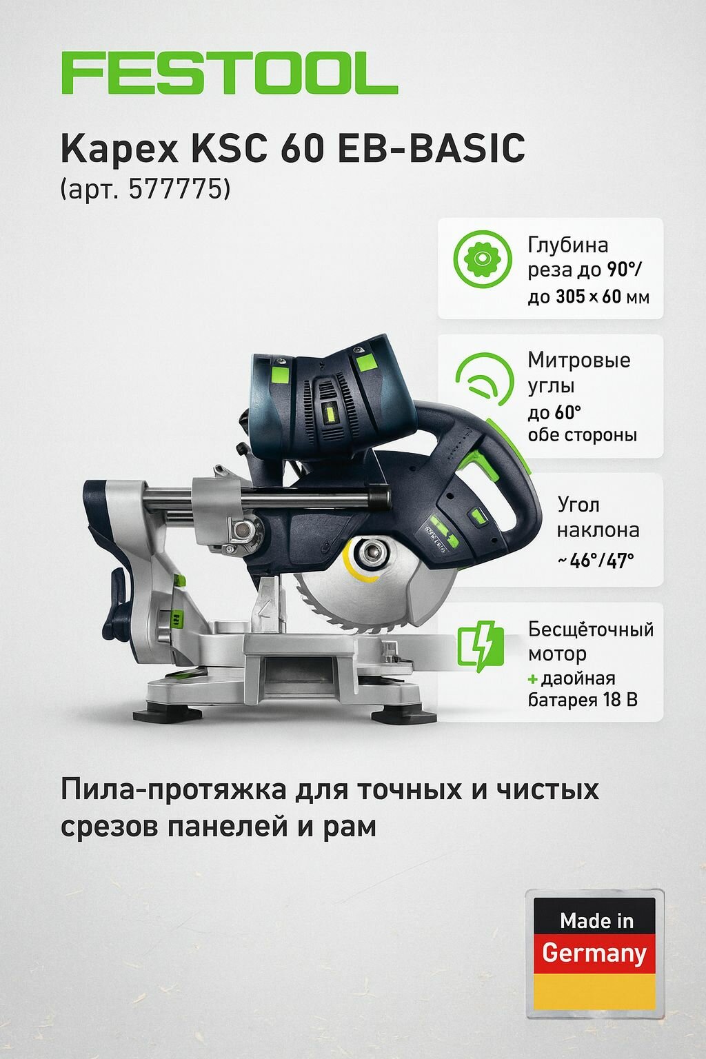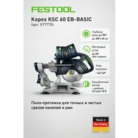 Купить Пила торцовочная c протяжкой Festool Kapex KSC 60 EB-BASIC с доставкой по всей России. Пила торцовочная c протяжкой Festool Kapex KSC 60 EB-BASIC: сравнение цен, характеристики, фото, актуальное наличие и цены.