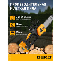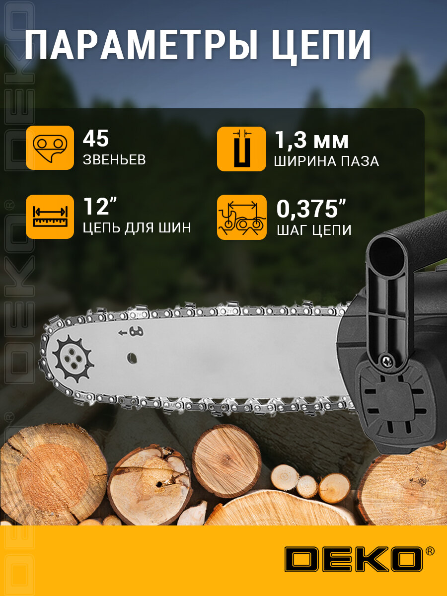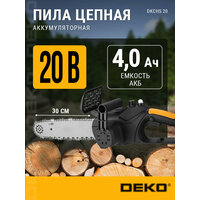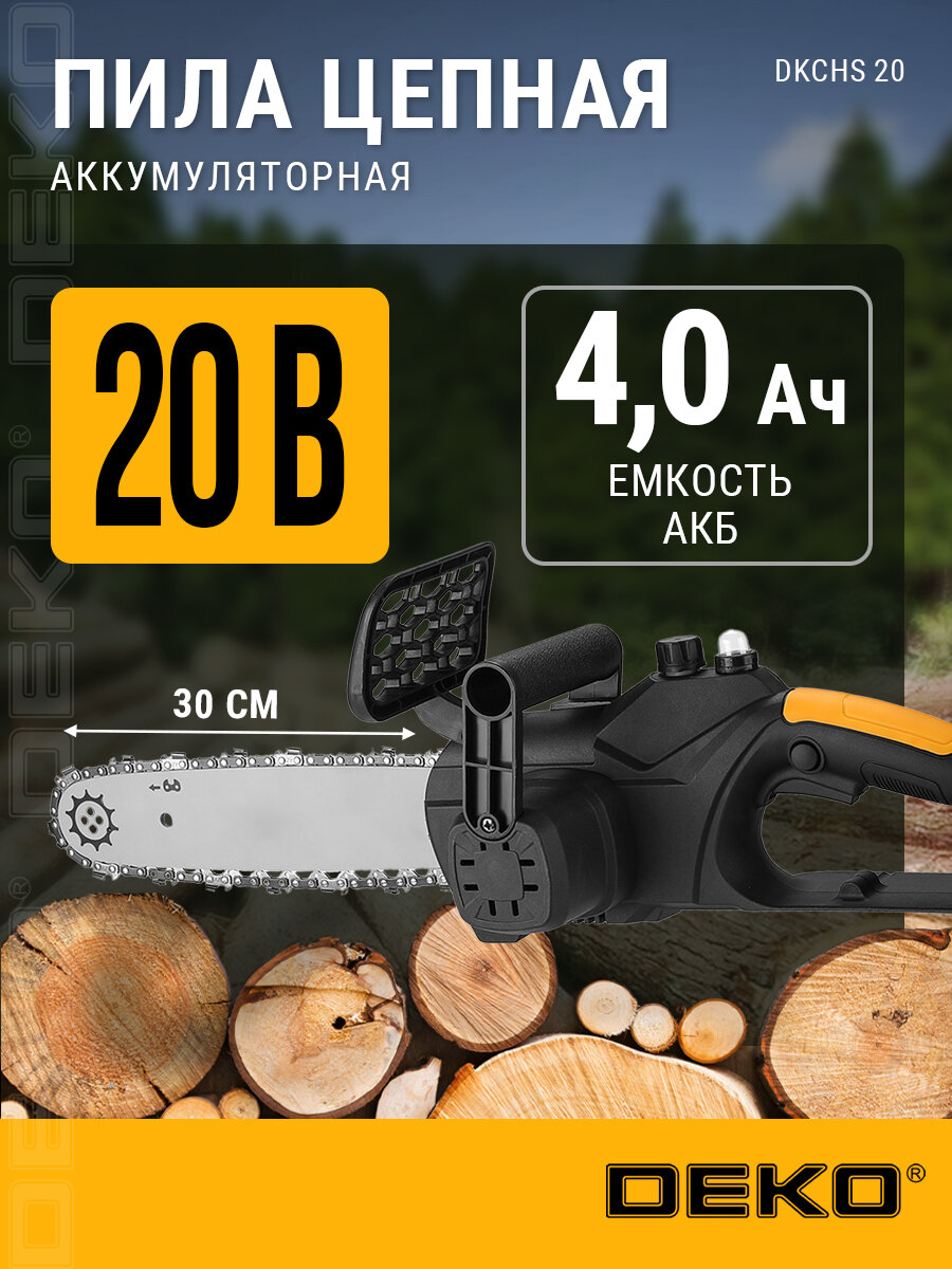 DEKO DKCHS 20 — это мощная универсальная электропила, сочетающая в себе надежность, мобильность и безопасность. Инструмент входит в набор решений для бытового и полупрофессионального применения, работает на батарейках (Li-Ion аккумуляторе) и не требует подключения к электросети.