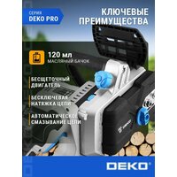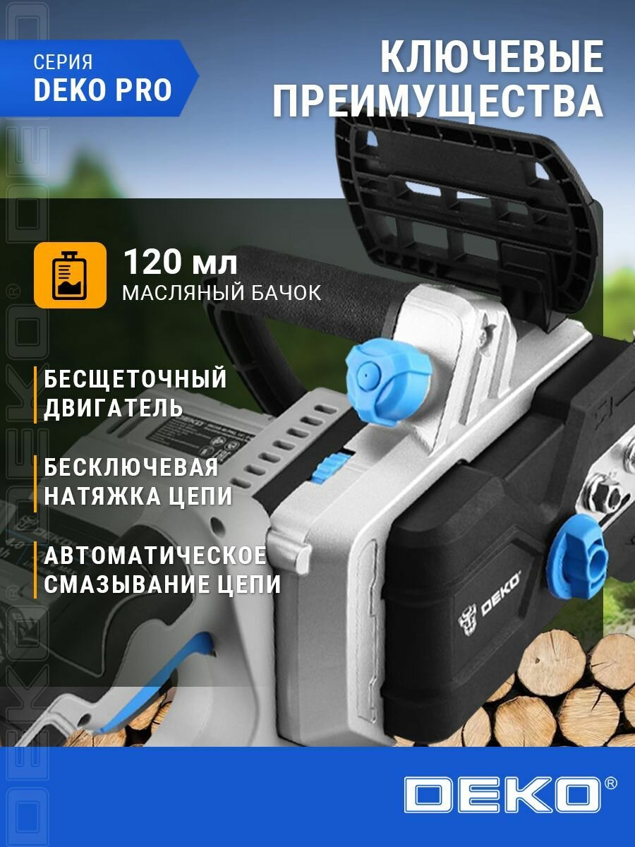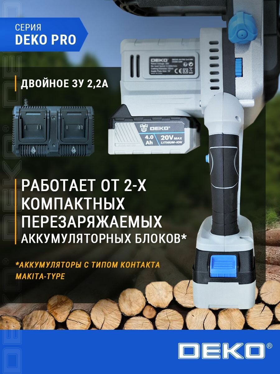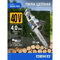 Купить Пила цепная аккумуляторная бесщеточная DEKO DKCHS 40 PRO, 14″, 2х20В, 2×4.0Ач, двойное з/у с доставкой по всей России.