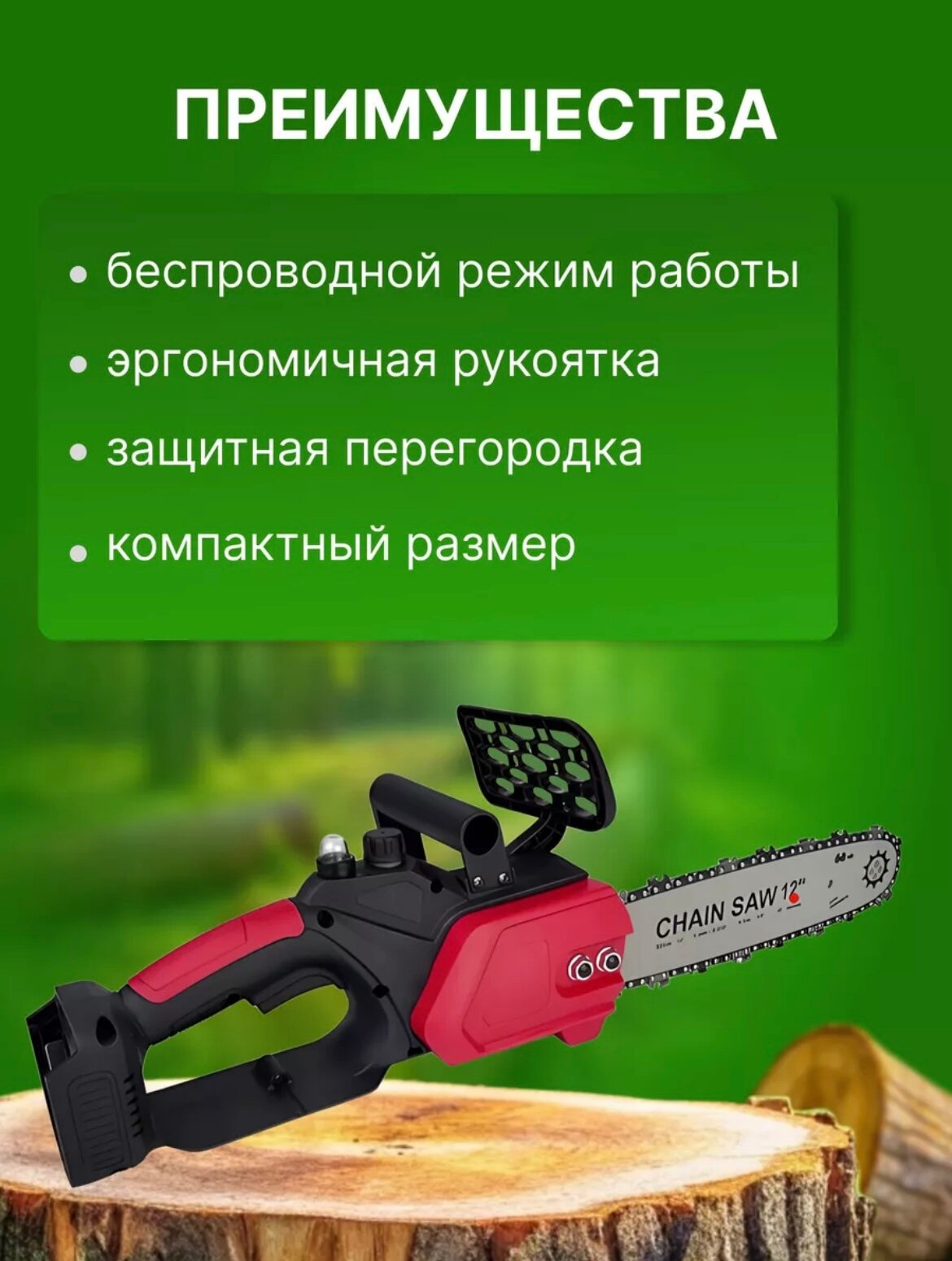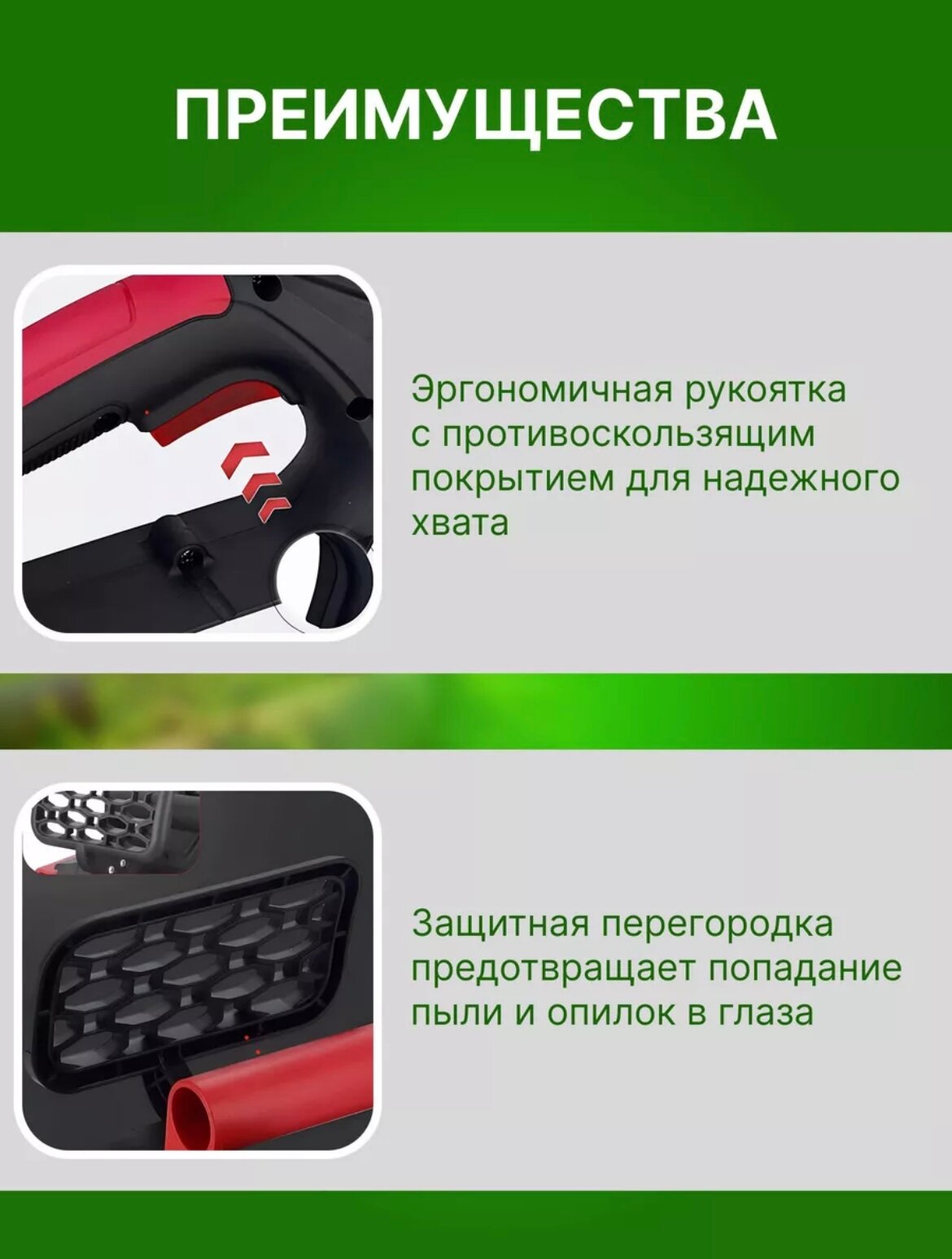 | Особенности конструкции | антивибрационная система, блокировка кнопки включения, мини-пила, прорезиненная рукоять |