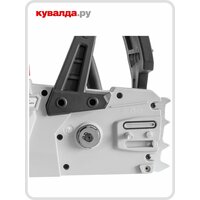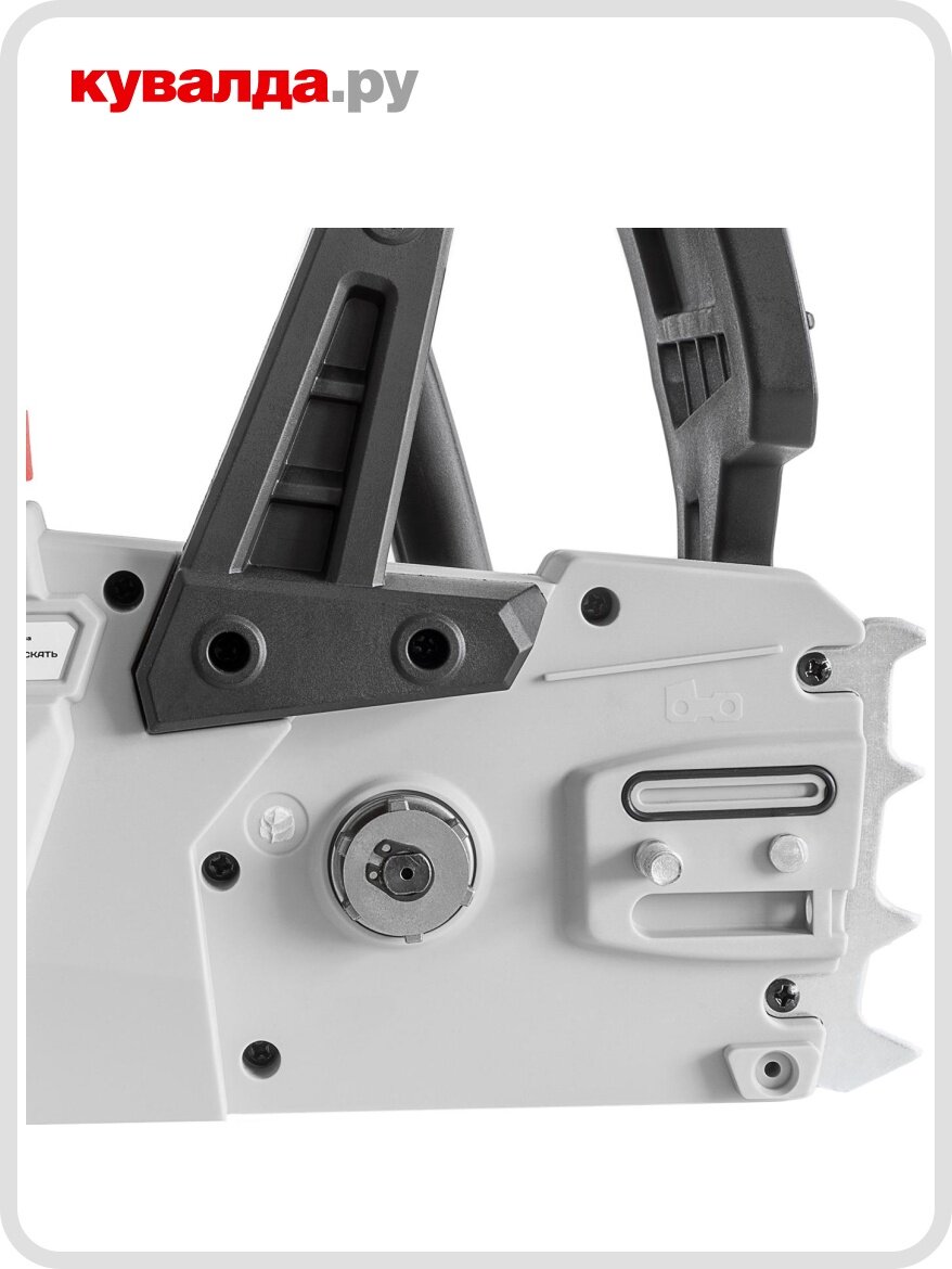 блокировка кнопки включения, прорезиненная рукоять, регулировка натяжения цепи без инструмента