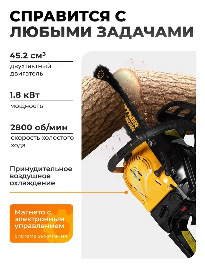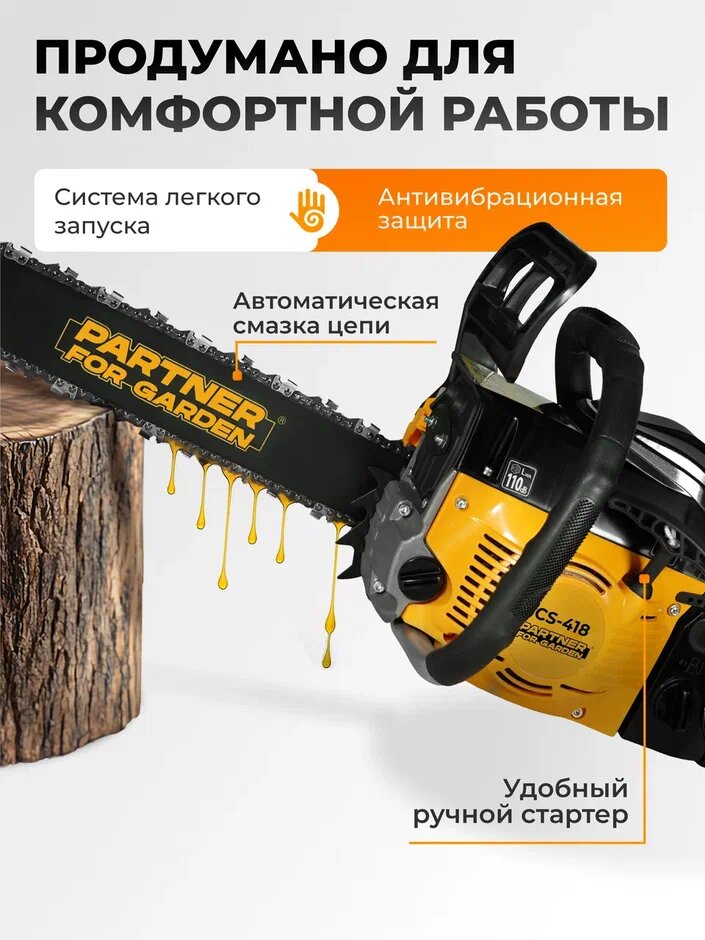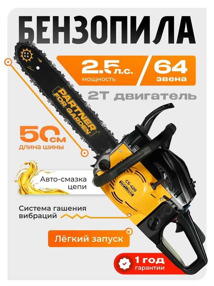 Пила цепная бензиновая / бензопила Partner for Garden СS-420 ( 45,2 куб. см, 2,5 лс, 2800 об/мин, 50см ): сравнение цен, характеристики, фото, актуальное наличие и цены.