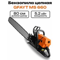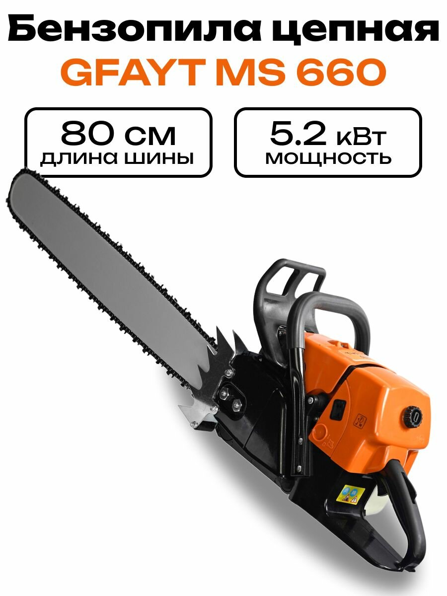 Бензопила цепная GFAYT MS 660 предназначена для тяжелых сельскохозяйственных и коммерческих работ. Разработан для тяжелой работы с большим лесом и рубки дров. Устройство обладает высокой мощностью и производительностью. Оснащен системой легкого пуска. Антивибрационная система - бензопила работает заметно мягче. Боковой натяжитель цепи позволит оператору контролировать натяжение цепи. В комплект входит емкость для смешивания топливной смеси. Длина шины 32" 80см. Шаг цепи 3/8", 96 зуб. Мощность 5.2 кВт/ 7.1 лс.