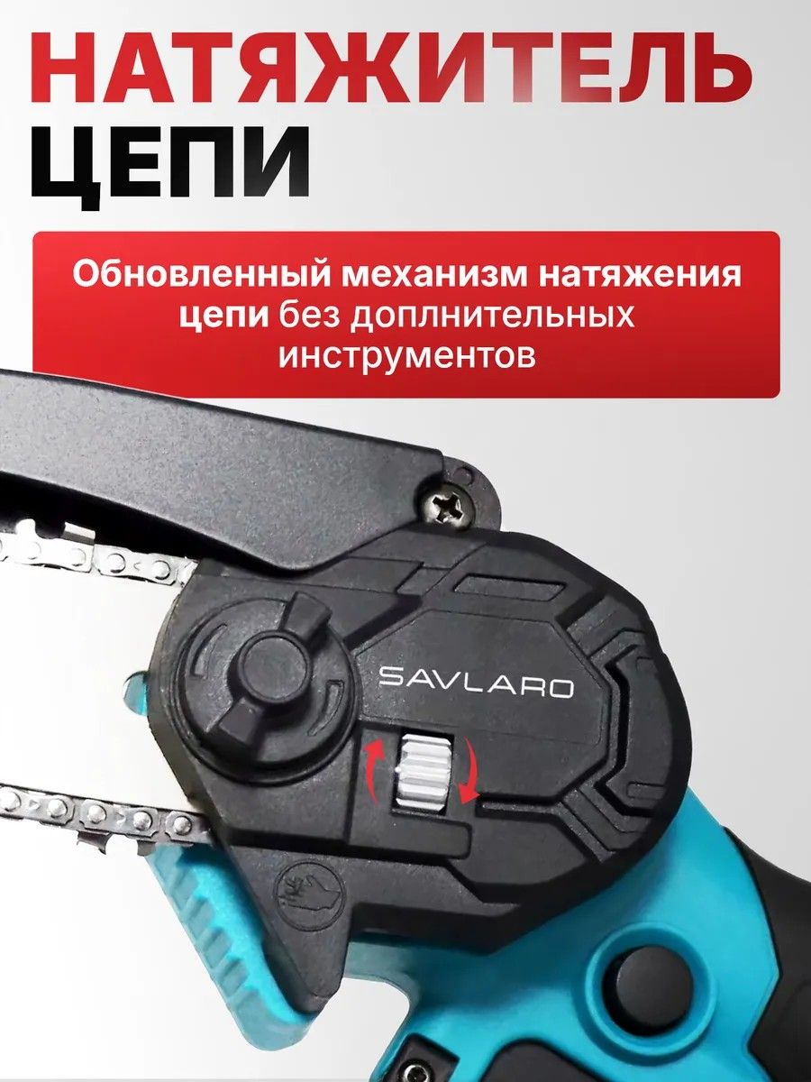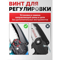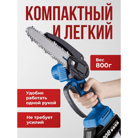 Цепная аккумуляторная пила — это удобный и практичный инструмент для работы в саду или на даче. Она работает от аккумулятора, что обеспечивает мобильность и независимость от электросети. Благодаря отсутствию токсичных выхлопов, мини электропила идеально подходит для работы в закрытом помещении. Комплектация с двумя аккумуляторами позволит увеличить время непрерывной работы. Садовую электро пилу используют для ухода за садовым участком, подрезки веток, демонтажа старых деревянных конструкций, ремонта и строительства, а также для распиловки бруса, досок и пластиковых труб. Безопасность оператора обеспечивается защитным кожухом и дополнительной кнопкой, которая обеспечивает защиту от случайного запуска минипилы. Благодаря своей автономности и отсутствию вредных выбросов, ручная электрическая пила для сада станет незаменимым помощником на даче или на природе. Лёгкий вес и компактные размеры сучкореза позволят работать даже одной рукой и без дополнительных усилий. Замена и регулировка цепи происходят быстро без инструмента разборки благодаря современным технологиям. Управлять электроцепным аппаратом комфортно в силу удобной кнопке-блокиратору пускового курка и ударопрочному корпусу. Компактный размер электро минипилы заменит тяжелые бензопилы, ножовки, электроножовки, электросучкореза, кустореза и другие устаревшие электроинструменты благодаря своей многофункциональности. Противоскользящая ручка позволяет использовать ее взрослой рукой: мужской и женской. Небольшой сучкорез с электромотором и зарядником отличный подарок на праздник, новый год и день рождения учителю, коллеге, папе, дедушке, брату, сыну, мужчине, женщине в качестве туристического, дорожного и походного инвентаря. Запасной литиевый АКБ делает её надежным товаром для строительных, хозяйственных, ремонтных, огородных и бытовых задач, а также пригодится при ремонте на рыбалке, в лесу или в путешествии.