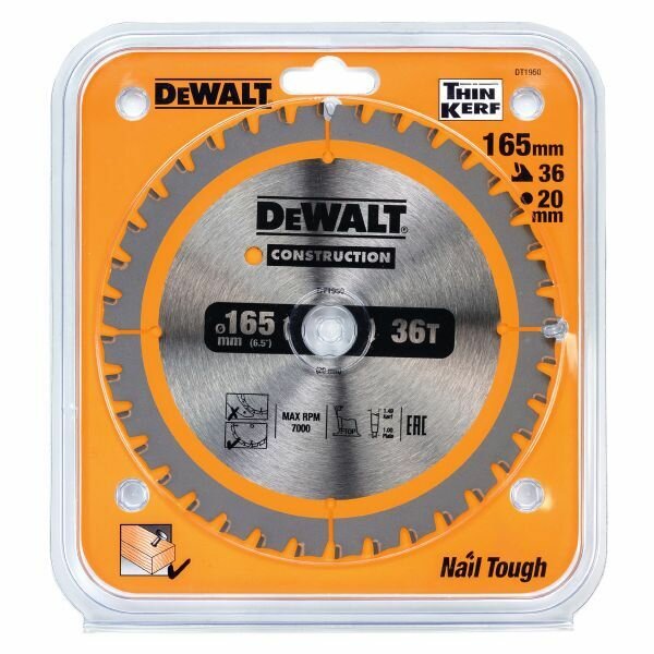 Пильный диск DEWALT CONSTRUCTION, по дереву с гвоздями, 165/20, 36 FTG, DT1950: сравнение цен, характеристики, фото, актуальное наличие и цены.