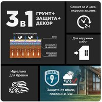 Быстросохнущая пропитка-антисептик на гибридной основе для защиты древесины до 9 лет. Формула 3 в 1. Грунт: обеспечивает равномерное впитывание в древесину; пропитка-антисептик защищает от плесени + образует декоративное финишное покрытие. Гибридное акрил-алкидное связующее образует атмосферостойкое паропроницаемое покрытие, древесина продолжает «дышать». Эластичное тонкое покрытие идеально подходит для обработки бревенчатых фасадов и бань. Вода в качестве растворителя, поэтому пропитка-антисептик имеет нейтральный запах, легко наносится и быстро сохнет. Сохраняет видимой текстуру древесины, полуматовая. Чем более насыщенный цвет пропитки, тем более выражены защитные свойства.
