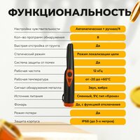 Высокая чувствительность; Пылевлагозащищенный корпус в соответствии с IP68; 8 программ обнаружения; 4 уровня чувствительности (3 фиксированных + 1 настраиваемый пользователем); Быстрая отстройка от грунта; Статический режим - режим локализации цели; Система защиты от помех; Световая, звуковая и вибросигнализация + фонарь с функцией отключения; Индикация разряда батареи; Низкое энергопотребление; Широкий диапазон рабочих температур; Эргономичная конструкция; Режим "потери" (в течении 40 минут прибор сигнализирует раз в 10 секунд после 5 минут простоя)