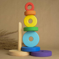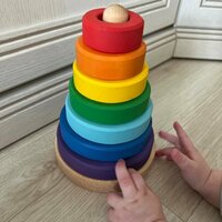 Элементы детской развивающей игрушки изготовлены из массива дерева и покрыты натуральным цветным воском, которое применяют мировые лидеры в изготовлении детских деревянных игрушек. Цветной воск в отличии, например, от акриловой краски, покрывающей поверхность как резина, впитывается в поверхность дерева на несколько миллиметров, что позволяет сохранить неповторимую текстуру натурального дерева. На сегодняшний день цветной воск является одним из самых лучших и экологичных покрытий для детских деревянных игрушек. Деревянная детская большая пирамидка тактильно очень приятная. Во время игры с деревянной пирамидкой сортером ребенок ощущает фактуру дерева, приятную тяжесть натурального материала и его природное тепло. Каждая деревянная развивающая игрушка изготовлена вручную и уникальна, второй такой нет. Элементы деревянной пирамидки для детей изготовлены с учетом размера маленьких детских ладошек, чтобы ребёнку было удобно брать колечки пирамидки в ручки и самостоятельно играть с ними. Кольца пирамидки легко нанизываются и снимаются со стержня пирамидки. Высота пирамидки - 18 см. Диаметр основания пирамидки - 12 см. Диаметр самого маленького колечка - 5 см. Круглая большая пирамидка игрушка для малышей в цветах радуги отлично сочетается и дополняет другие наши деревянные игрушки для раннего развития детей. Например, бусины из деревянной шнуровки для детей можно сортировать по цвету, раскладывая их в отверстия колец пирамидки для детей.