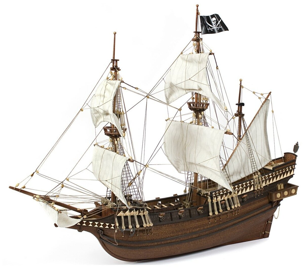 Галеон, да еще и пиратский, да еще и небольшой по длине, да еще и для начинающих, да еще и с готовыми парусами! Такой модели до сих пор не было ни у одного производителя. Несомненно, модель корабля Buccaneer заслуживает того, чтобы стать bestseller-ом. Лишь бы содержимое коробки не подкачало. Итак, открываем и смотрим, что нам предлагает испанская фирма OcCre. Полноценный наборный корпус с двойной обшивкой и настилом палуб отдельными рейками. Количество реек дано с явным запасом, поэтому можно не бояться что-то испортить по первому разу. Готовые фальшборта с прорезанными лазерной резкой пушечными портами (не надо будет упорно вымерять положение портов и затем прорезать их), деревянные решетки; восемь литых пушек на металлических лафетах и четыре фальш-пушки, кормовой фонарь, якоря, нагеля, эзельгофты и шлюпка из металла, латунные петли для руля, рымы, цепочка – всё это входит в набор, все эти детали вы должны будете поставить на свои места, всё это будет составной частью модели пиратского галеона Buccaneer. Кроме того, в этой модели начального уровня применяются и фототравленные детали, что скорее типично для более дорогих моделей. Фототравлением даны двери, утки, сборные трапы, кормовой декор и петли пушечных портов. Геометрический рисунок на корпусе модели корабля предлагается вырезать из бумаги и наклеить на место. Для рангоута предусмотрены круглые заготовки светлого дерева, а для такелажа лежат светлые и темные нити разных диаметров. Блоки и юферсы типичны для испанцев – светлое дерево. И, как это часто бывает у OcCre, к модели галеона прилагаются готовые паруса. Инструкция по сборке в пошаговых цветных фотографиях и схемах, которые проведут вас от закладки киля до заключительных узелков на такелаже. Кроме того, мы выполнили и прилагаем перевод инструкции на русский язык.
