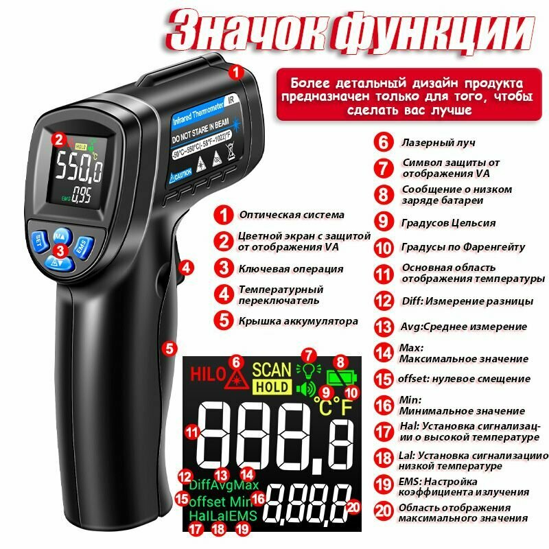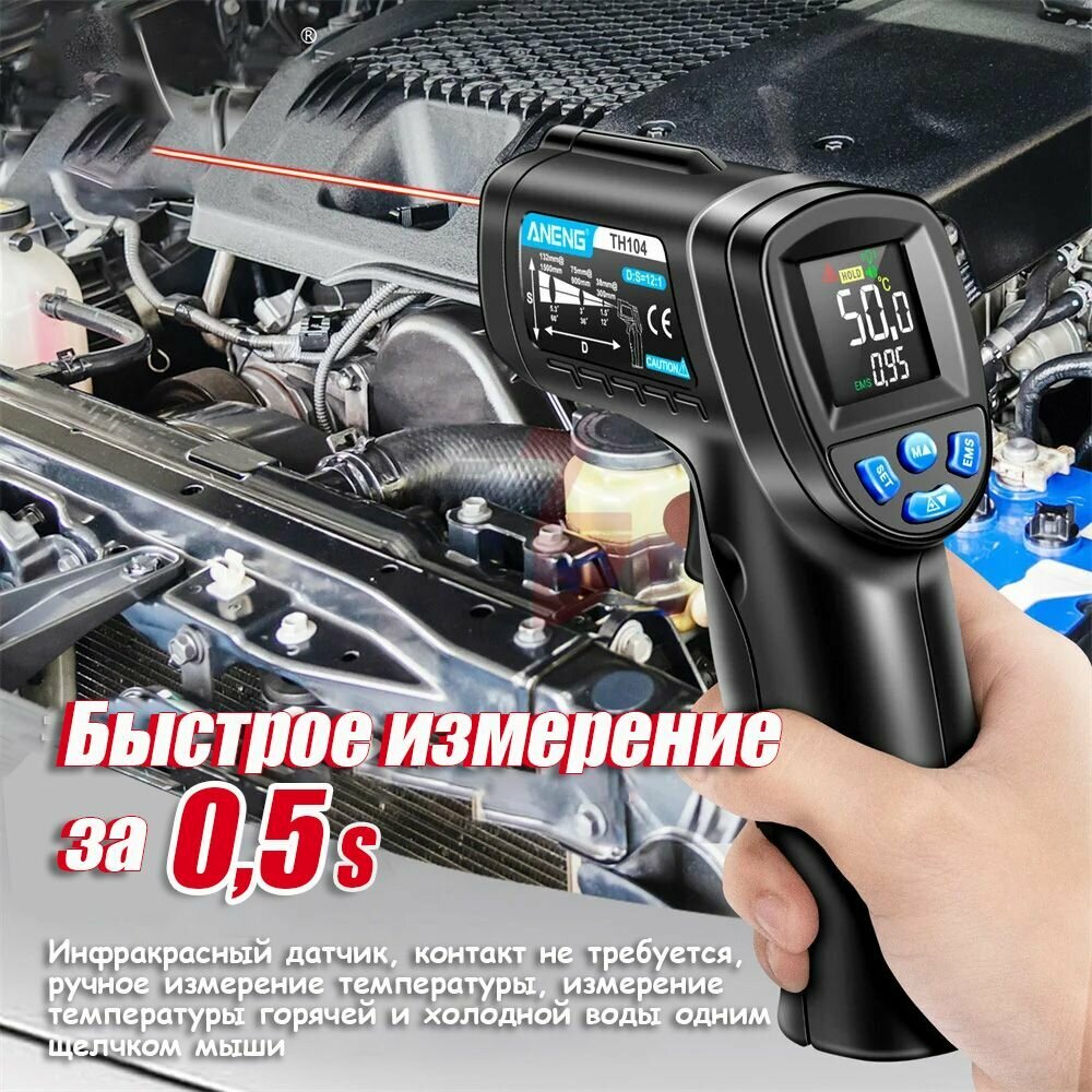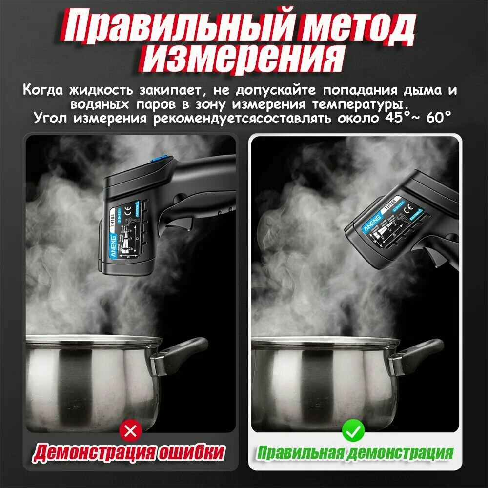 Промышленный термометр ANENG TH104 полезен в разных областях: при монтаже кондиционеров, приготовлении еды, измерении температуры кипящей воды или масла (главное чтобы пары не попадали на сам прибор), в промышленности, в быту и во многих других труднодоступных и опасных местах, он применяется для измерения температуры поверхности без контакта с ней в диапазоне от -50°С до +550°С.