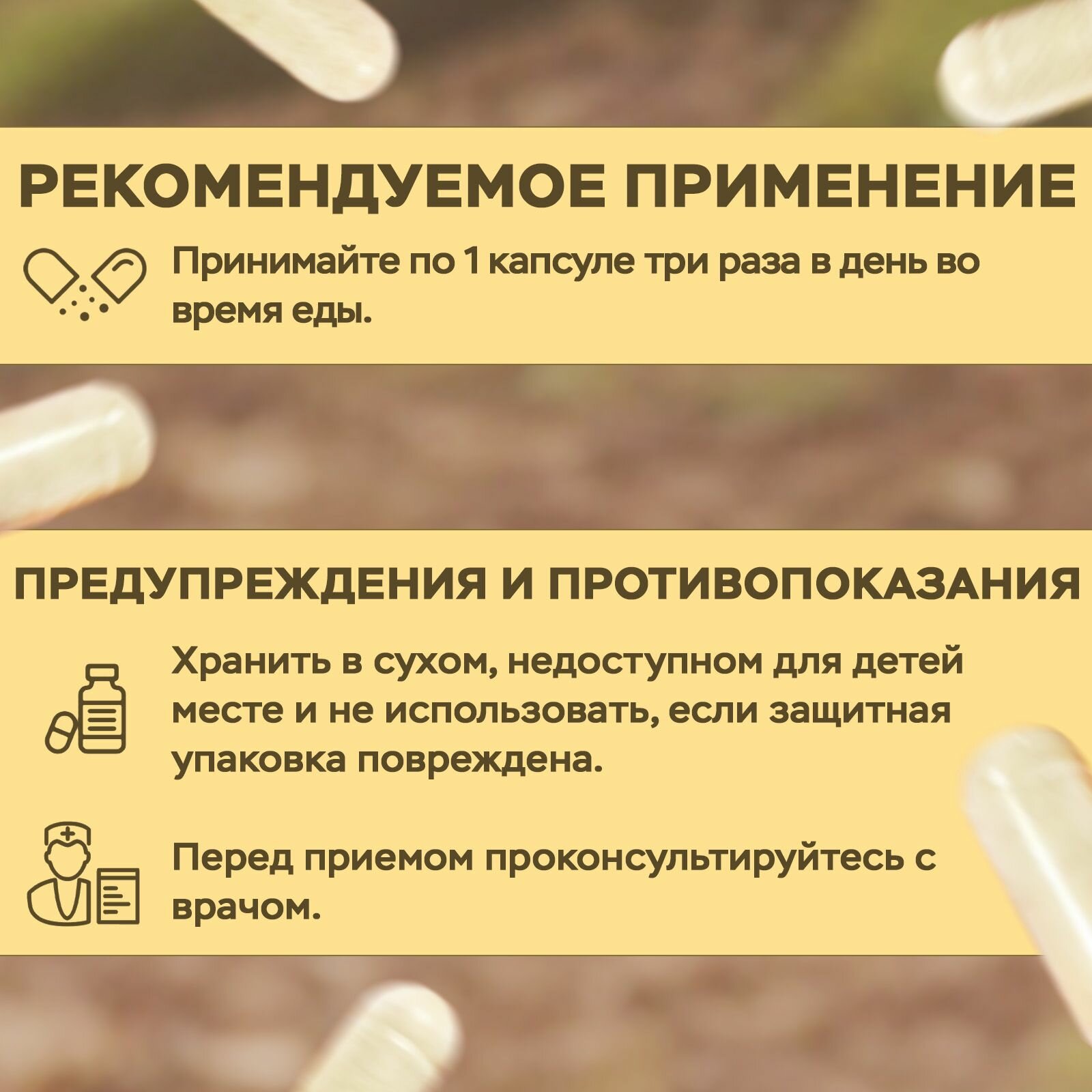 Принимать по 1 капсуле 3 раза в день натощак, за 1 час до или через 2 часа после еды. Проконсультируйтесь с врачом перед использованием, если вы беременны, кормите грудью, принимаете лекарства или имеете заболевание.