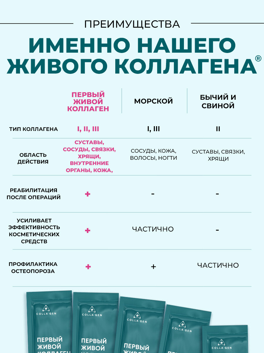 Пищевой живой коллаген в саше. Оптимальная дневная доза - 10 грамм. 30 саше - курс 1 месяц. Пищевой COLLA GEN – уникальный биокомплекс! Гидролизат коллагена пищевой – специальная, легкоусваиваемая форма коллагена белка, который является основным строительным веществом соединительных тканей - сухожилий, связок, хрящей и отвечает за их прочность и эластичность. Присутствует во внутрисуставной жидкости, костях, кровеносных сосудах, волосах, коже и ногтях Удобно брать с собой! Теперь живой коллаген с Вами в дороге и в путешествии!
