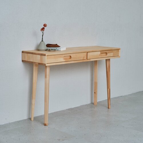 ✔ Особенности письменного стола Fusion: 1) Ширина столешницы 60 см. Длина на выбор - 100 или 120 см. Много рабочего пространства 2) Корпус и фасады стола изготовлены из массива уральской берёзы 3) Внутри ящики облицованы берёзовой фанерой в тон корпуса. Задняя панель — также из берёзовой фанеры 4) Овальные ручки фрезы на ящиках
