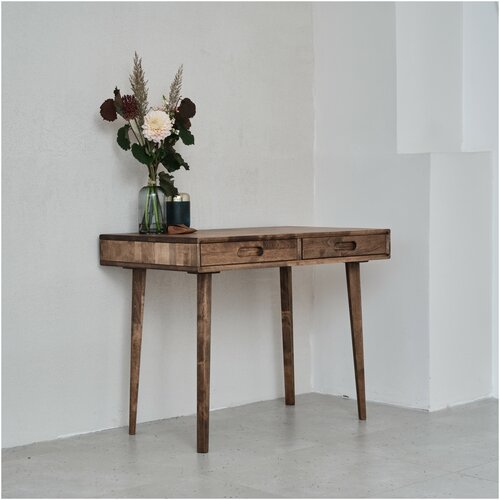 Лаконичный и удобный стол Fusion в стиле мидсенчури станет атмосферным дополнением вашего кабинета. На высоких тонких опорах, с двумя выдвижными ящиками, выразительной фрезеровкой корпуса.