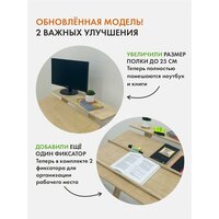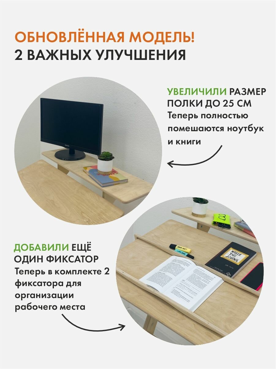 Размер столешницы 80х55 см. В комплекте к столу письменному входят 2 фиксатора и верхняя полка шириной 25 см для монитора компьютера и рабочих вещей.