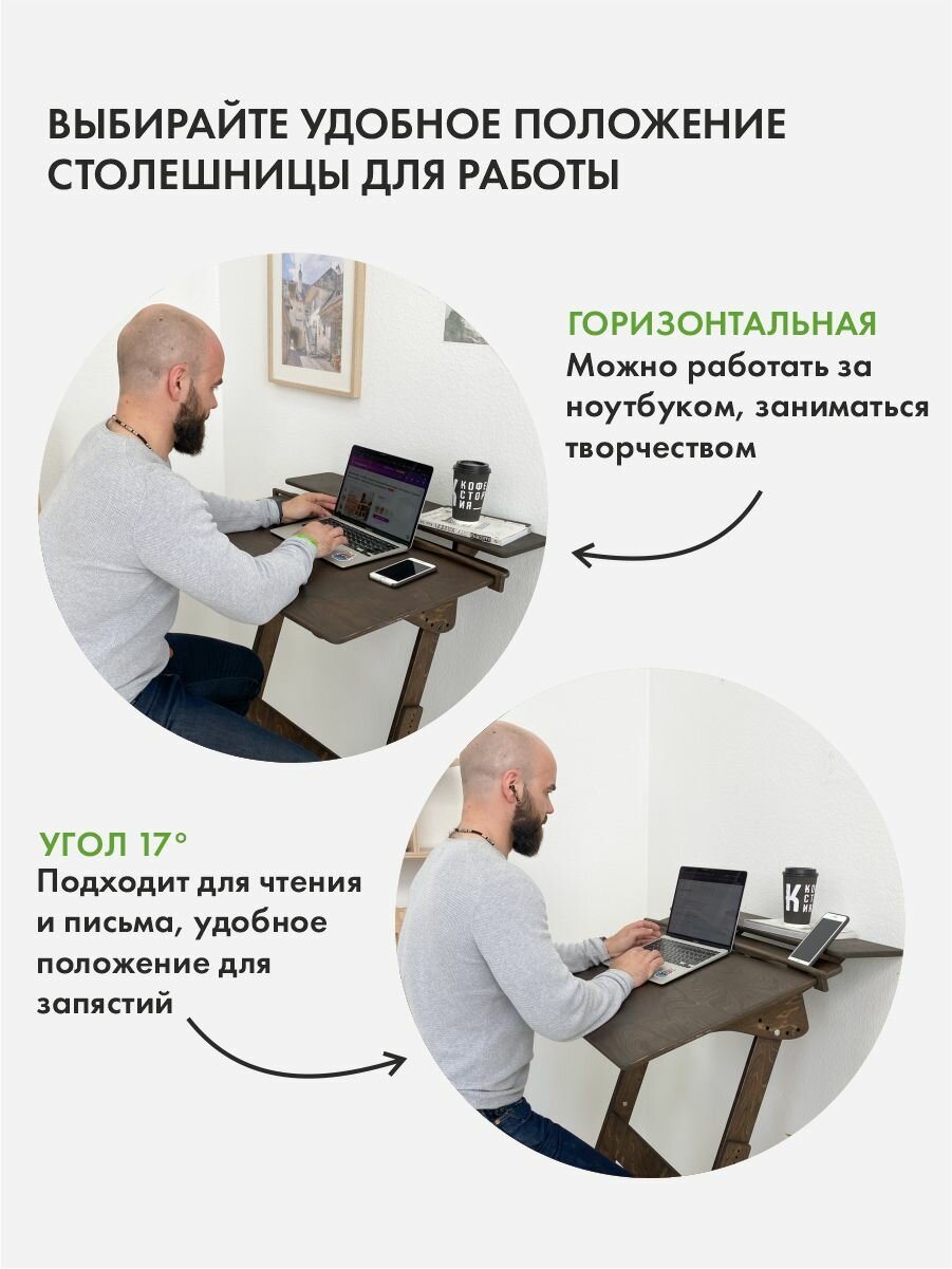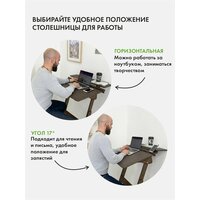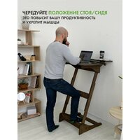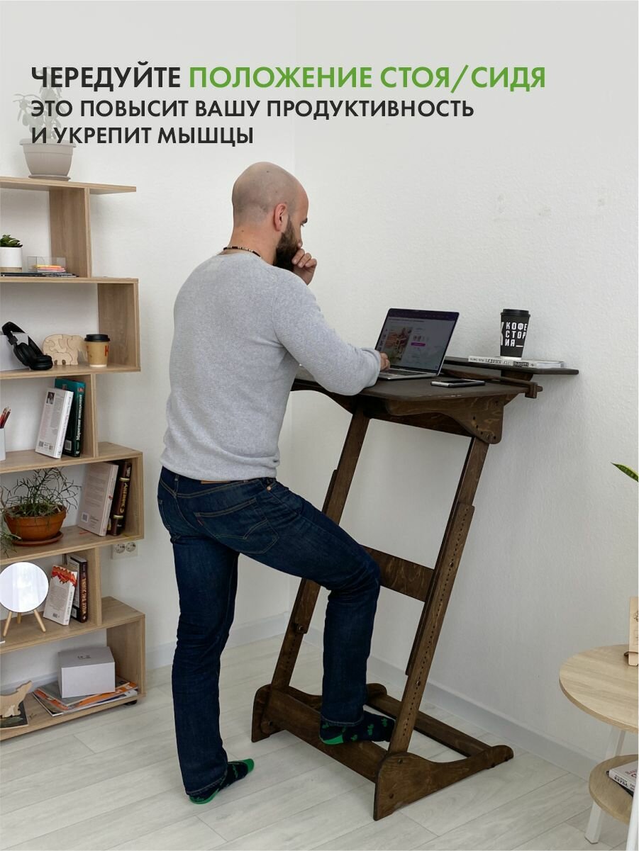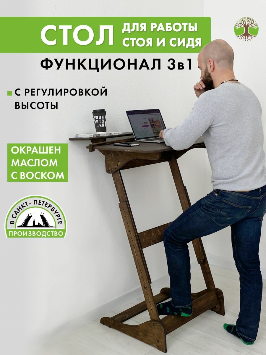 Представляем вам письменный стол для работы стоя Добрыня - надежный и простой вариант для работы за компьютером или ноутбуком. Этот высокий стол является идеальным решением, если у вас уже есть рабочий стол и вы хотите чередовать положения стоя и сидя. Добрыня - оптимальный столик для работы стоя для взрослых и подростков школьников высотой от 150 см. Этот стол трансформер, потому что его высоту можно регулировать под ваш рост. Край столешницы под наклоном 17°-34° должен находиться на уровне солнечного сплетения - это наиболее правильное положение по мнению врачей. Врачи рекомендуют читать, писать и рисовать на наклонной поверхности, чтобы сохранить осанку и зрение, и поэтому у столешницы Добрыни несколько положений. С плоской поверхностью его можно использовать как компьютерный стол или столик для ноутбука; наклонная столешница под углом 17° превращает его в конторку; углы наклона 34°-68° можно использовать как мольберт для рисования. Используйте этот стол для работы стоя в офисе или в квартире, если работаете из дома. Это отличный вариант стендмебели по доступной цене. Чтобы ваша работа была комфортной, возьмите к столу барный стул. Так вы сможете чередовать положения, не меняя высоты вашего столика. Размер столешницы 80х55 см. В комплекте к столу письменному входят 2 фиксатора и верхняя полка шириной 25 см для монитора компьютера и рабочих вещей. Стол Добрыня устойчивый и компактный — поместится в любой угол комнаты. Этот стол конторка деревянный, поверхность гладкая, приятная на ощупь, без зацепок и неровностей. Столик покрыт мебельным маслом. Внимание! Для сборки вам понадобится крестовая отвертка!