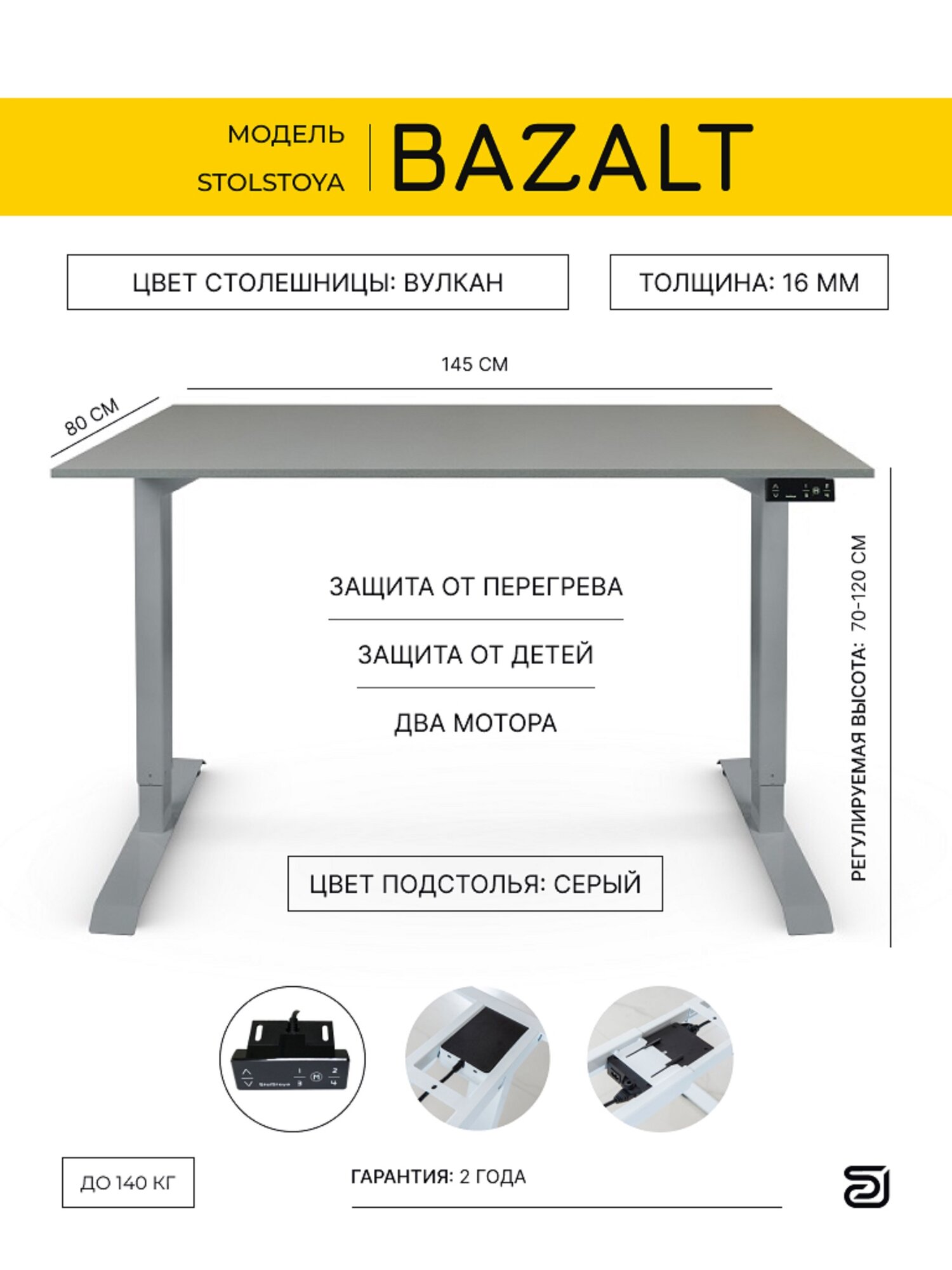 Компьютерный стол STOLSTOYA регулируемый для работы сидя и стоя BAZALT серый, столешница ЛДСП Вулкан 145x80x122 см: сравнение цен, характеристики, фото, актуальное наличие и цены.