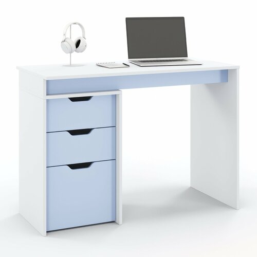 Письменный стол имеет современный дизайн. Его функциональность обусловлена универсальной сборкой. Стол оборудован тремя ящиками, которые используют шариковые направляющие, что обеспечивает их легкое открытие и закрытие, а также плавное скольжение. Столешница защищена кромкой из ПВХ толщиной 2 мм, остальные детали имеют кромку ПВХ толщиной 0.4 мм. Это обеспечивает столу защиту от повреждений, таких как сколы и трещины. Особенностью данного стола является отсутствие ручек, ящики открываются за край фасадов. Размеры стола: ширина – 1100мм, высота – 750 мм, глубина – 500 мм. Стол поставляется в разобранном виде, в фабричной упаковке и инструкцией по сборке.