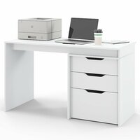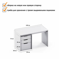 Письменный стол имеет современный дизайн. Его функциональность обусловлена универсальной сборкой. Стол оборудован тремя ящиками, которые используют шариковые направляющие, что обеспечивает их легкое открытие и закрытие, а также плавное скольжение. Столешница защищена кромкой из ПВХ толщиной 2 мм, остальные детали имеют кромку ПВХ толщиной 0.4 мм. Это обеспечивает столу защиту от повреждений, таких как сколы и трещины. Особенностью данного стола является отсутствие ручек, ящики открываются за край фасадов. Стол поставляется в разобранном виде, в фабричной упаковке и инструкцией по сборке.