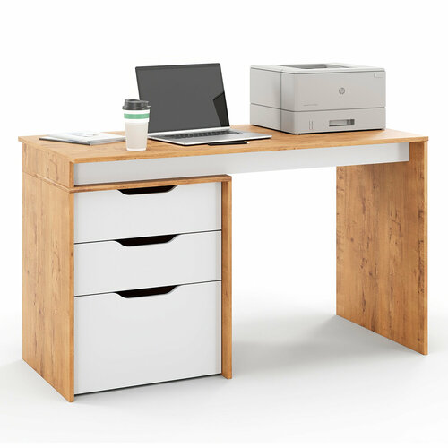Письменный стол имеет современный дизайн. Его функциональность обусловлена универсальной сборкой. Стол оборудован тремя ящиками, которые используют шариковые направляющие, что обеспечивает их легкое открытие и закрытие, а также плавное скольжение. Столешница защищена кромкой из ПВХ толщиной 2 мм, остальные детали имеют кромку ПВХ толщиной 0.4 мм. Это обеспечивает столу защиту от повреждений, таких как сколы и трещины. Особенностью данного стола является отсутствие ручек, ящики открываются за край фасадов. Стол поставляется в разобранном виде, в фабричной упаковке и инструкцией по сборке.