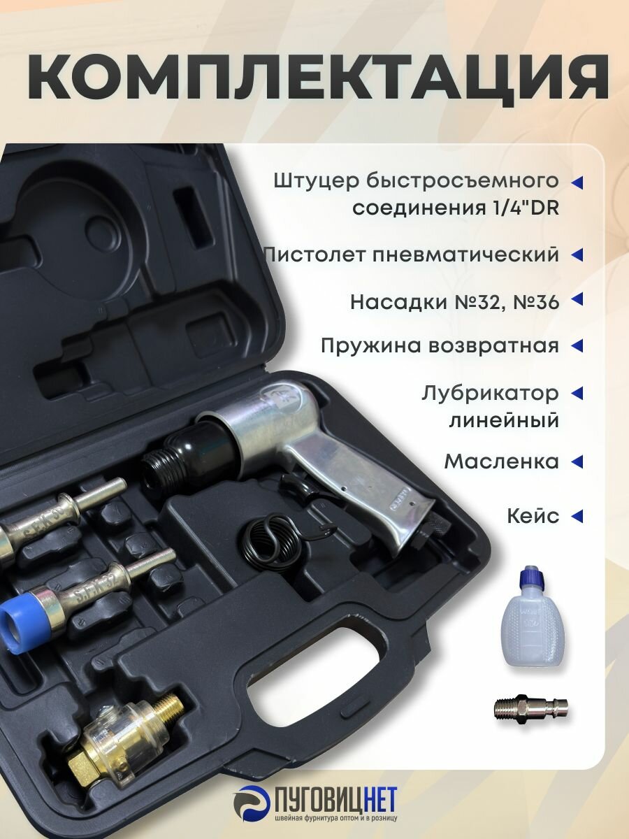 Инструмент подходит для использования как в профессиональной мастерской, так и в домашних условиях. Он станет незаменимым помощником для всех, кто занимается изготовлением и ремонтом мягкой мебели, обивкой дверей и других поверхностей. Пневматический пистолет — незаменимый инструмент для профессиональных мастеров и любителей, занимающихся изготовлением и ремонтом мебели. Он позволяет быстро и эффективно забивать обтянутые гвозди в деревянные поверхности, обеспечивая надёжное крепление обивки или декоративных элементов. Дополнительно вы можете приобрести резинки арт 5048947304, арт 5048988640. Пневматический пистолет для забивания обтянутых заготовок гвоздей в мебель. Пистолет в кейсе. В комплекте 2 насадки: 20,5 мм (для гвоздей арт 103468363646) и 23мм (для гвоздей арт 103468365602). Применяются для каретной стяжки мебели, диванов, стульев. Внимание: для работы требуется компрессор (в комплект не входит). Данный товар подходит для использования только с заготовками гвоздями нашего производства бренда Пуговицнет. У нас Вы можете приобрести швейное оборудование, фурнитуру и аксессуары. Нажимайте на название бренда и смотрите полный ассортимент.