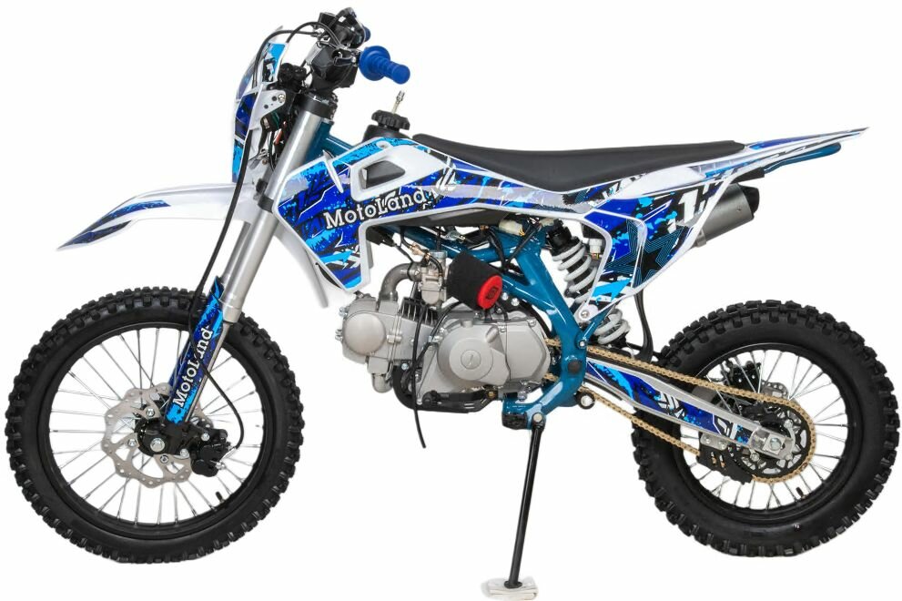 Пит-байк Motoland TCX125 идеален для поездок по грунтовым дорогам и бездорожью. Хорошо чувствует себя на мягком и среднем грунте, разгоняется до 90 км/ч. Оснащён спортивными траверсами, весит всего 75 кг. Пит-байк прост в управлении и не требует специального ухода, подойдёт как новичкам, так и любителям мотокросса. У пит байка отличный узнаваемый дизайн. Конструкция подчёркивает неуступчивый спортивный характер, который не остановится ни перед одним препятствием. Комбинированный прочный пластик не ломается при сгибании . Передняя подвеска — телескопическая вилка перевёрнутого типа, которая отлично подходит для преодоления ям, и других неровностей плохих дорог или их отсутствия. Задняя подвеска маятниковая с моно амортизатором . Пит-байк оснащён карбюратором с фильтром нулевого сопротивления Nibbi PE n19 и одноцилиндровым четырёхтактным двигателем с воздушным охлаждением. Надёжный мотор 153FMI мощностью 8 л. с. и объемом 125 см³ , установленный на усиленной стальной раме, коробка передач механическая, четырёхступенчатая . Тормоза дисковые, передний тормозной суппорт двух поршневой, задний — одно-поршневой . Пит-байк относится к недорогим моделям, которые при должной эксплуатации работают без сбоев. Не занимает много места в гараже. При необходимости в нём легко сменить любую повреждённую деталь. Рабочий объём-125