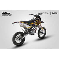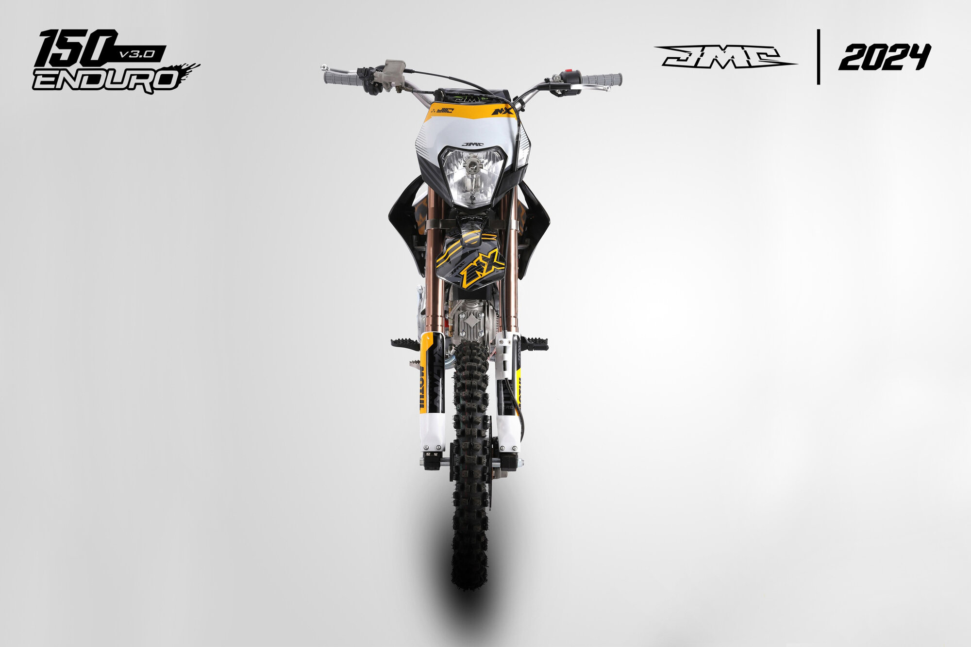 Новая модель JMC 150 Enduro 17/14 построена на базе хорошо зарекомендовавшей себя пространственной раме JMC V3.0 и оснащена двигателем YX 140 с электростартером. Топливную смесь готовит оригинальный карбюратор NIBBI PE19 с подобранными жиклерами и регулировками. Передняя подвеска - вилка JMC SUSPENSION 800 мм. CNC траверсы. Задний амортизатор JMC SUSPENSION 360 мм. Колеса на ободах с 36 спицами и кроссовой резиной. Эффективность торможения обеспечивают передний двухпоршневой тормозной суппорт и задний тормозной суппорт от полноразмерного кроссового мотоцикла. Байк оснащен обновленной комбинацией приборов, диодной фарой головного света, задним габаритным фонарем со стоп-сигналом. Установлен глушитель со съемным шумовым рестриктором и выпускным коллектором из нержавеющей стали.